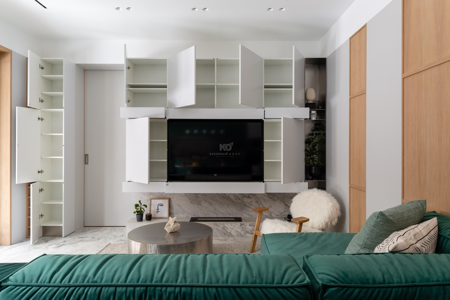 Строгий и одновременно «душевный» минимализм – вот что нужно было отразить в этих интерьерах. Для решения этой задачи в кухонной зоне дизайнеры «KD-Lab» избрали гарнитур «Оскар» с особыми фасадами из покрытой эмалью МДФ. А гостиную создали на основе модели «Фаворит», чьи фасады также покрыты эмалью, но по несколько иной технологии.