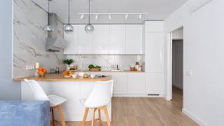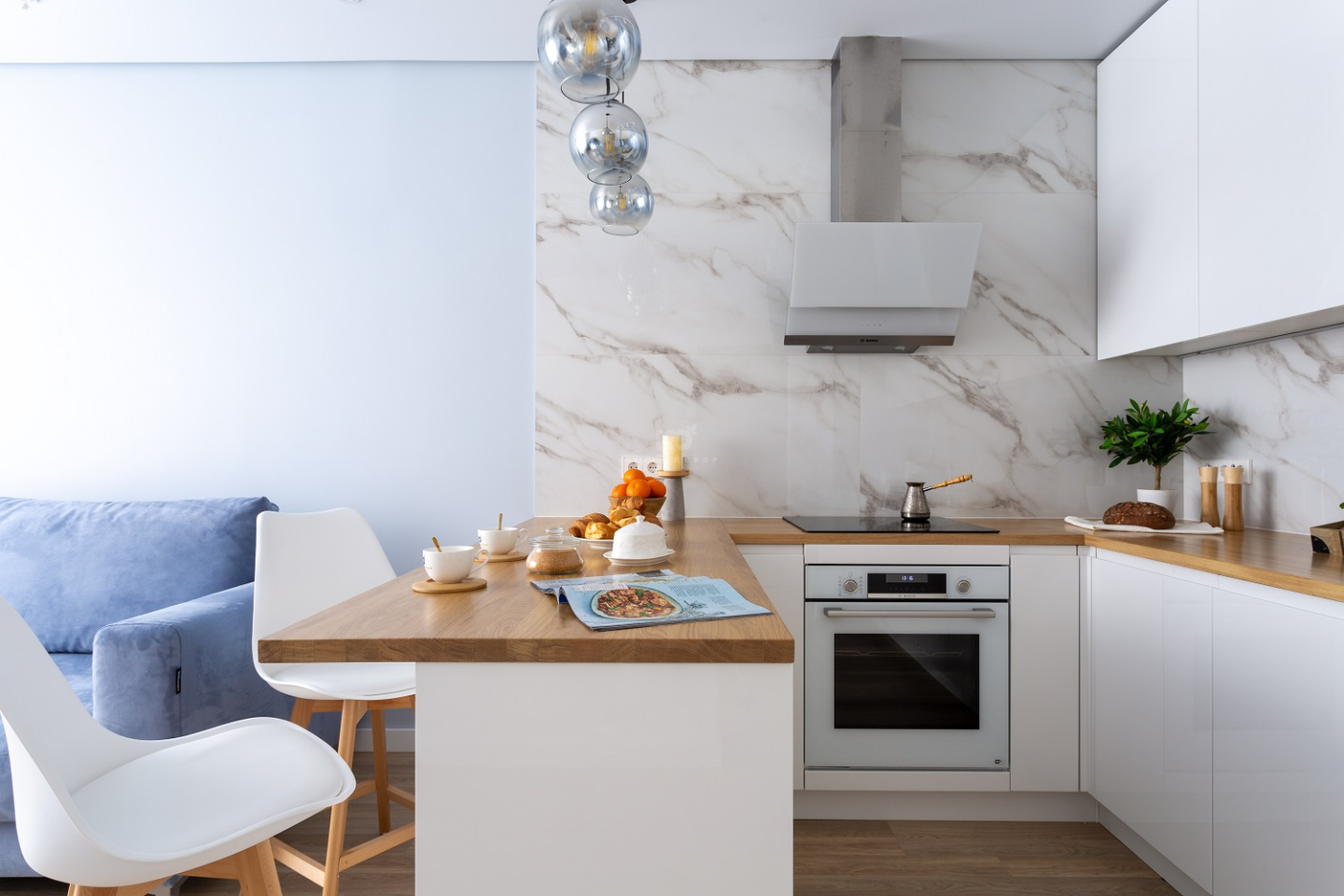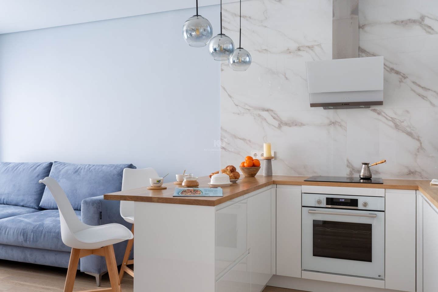 С красотой тоже полный порядок. Дизайнеры использовали беспроигрышное сочетание: белоснежные фасады из МДФ, покрытые эмалью, величественный фартук «под мрамор» и столешница с древесной текстурой «тёплого» оттенка. Да, это очаровательный «сканди» – стиль, в котором природные фактуры и модная лаконичность идеально дополняют друг друга! Отличное решение для светлой, просторной и максимальной уютной кухни-гостиной!