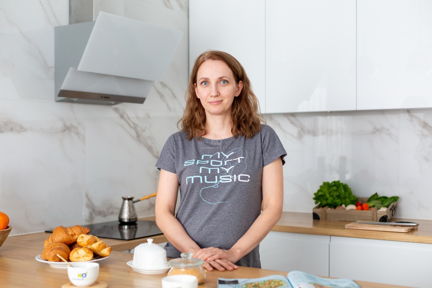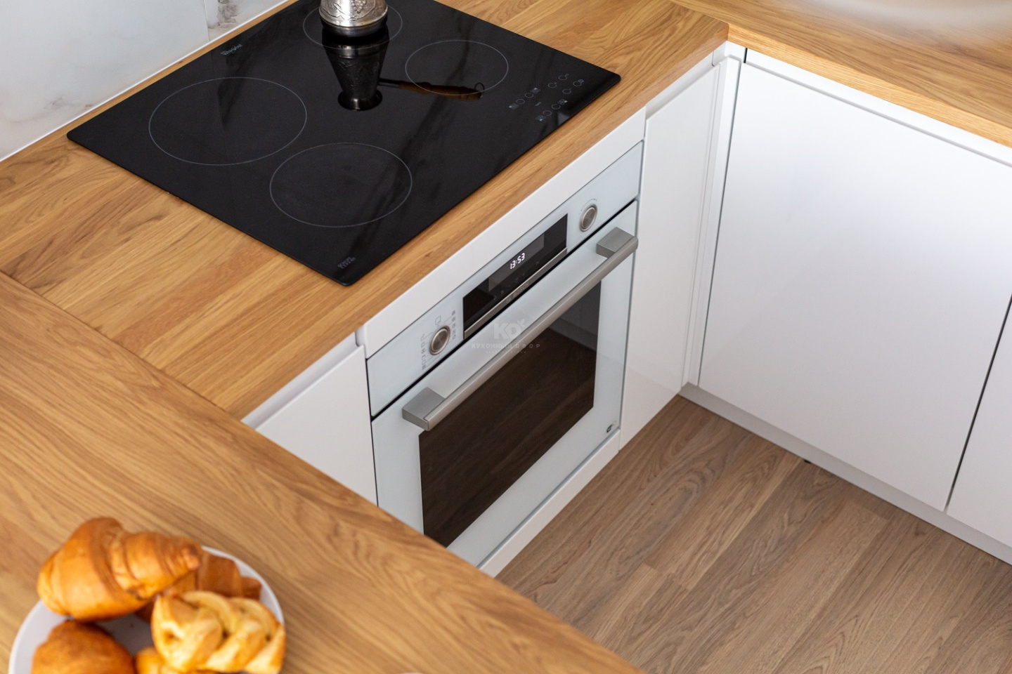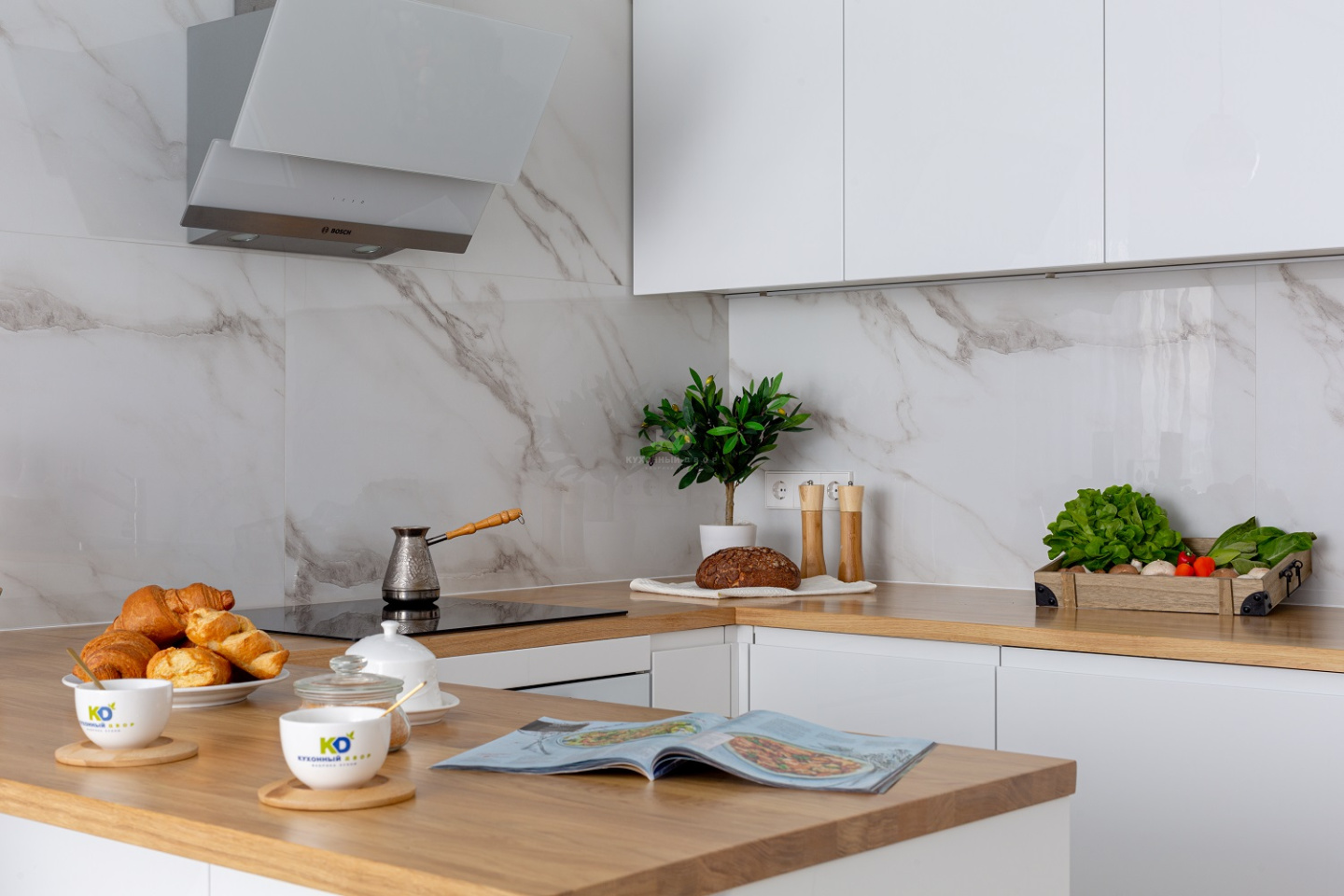 Белая, блистающая, высокая, с «мраморным» фартуком и красивой столешницей под светлое дерево. Эта кухня точно заслужила бы «Оскар» в номинации «Уют и функциональность»! Создавая её, дизайнеры бренда «Кухонный Двор» уделили равное внимание удобству и красоте. Поговорим обо всём!
