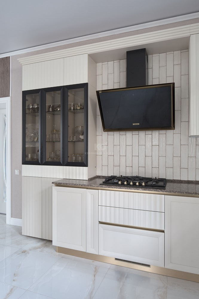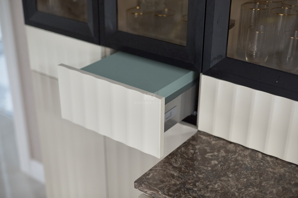 Модель «Патриция» выглядит по-настоящему роскошно. Она превосходна в своем нежном молочном оттенке, который удачно сочетается с черными контрастными элементами и фурнитурой под золото. Темный оттенок грамотно интегрирован в общую композицию – он подчеркивает линию столешницы.
