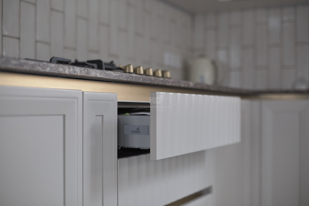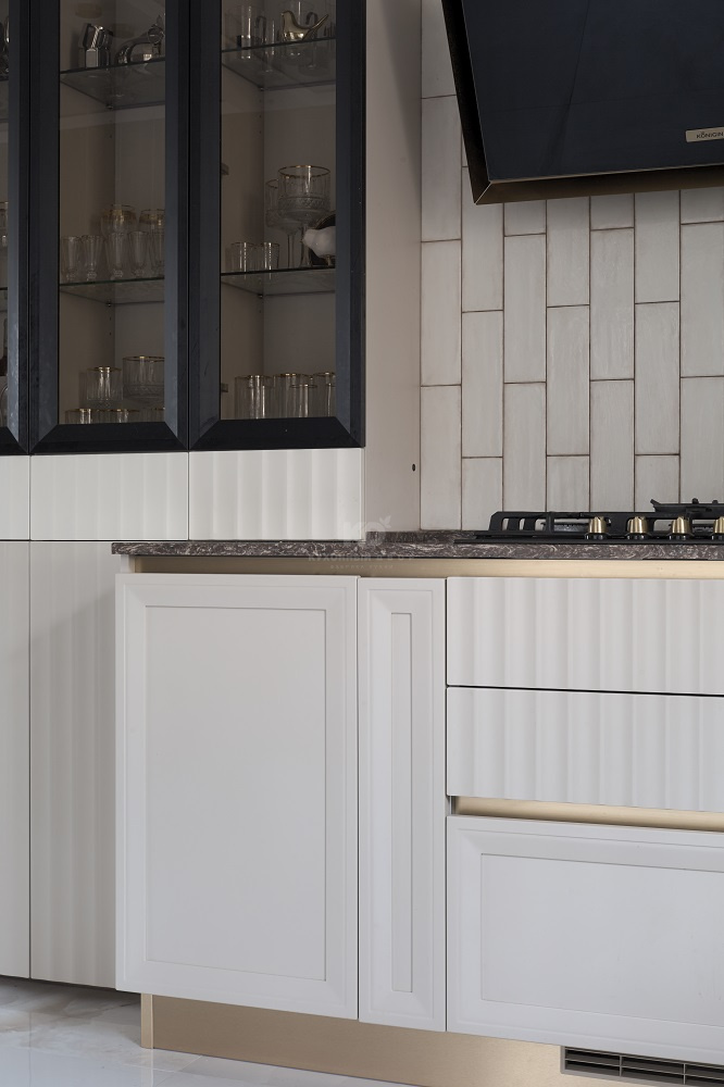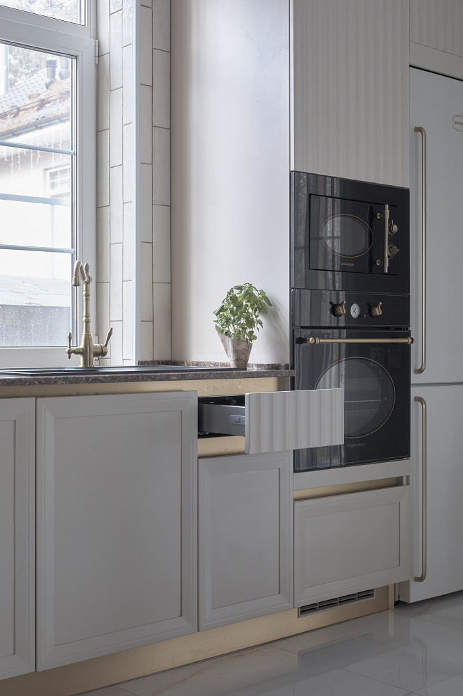 Располагающиеся по всему периметру гарнитура фасады оснащены скрытыми ручками-профилями под золото. Система «Space Line» визуально приподнимает столешницу над нижним ярусом, а также создает дополнительный акцент на некоторых ящиках. Кажется, будто кухня создана рукой талантливого скульптора – она особенно притягательна и изящна.