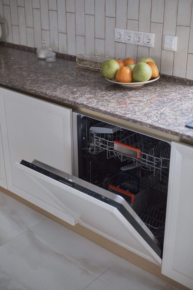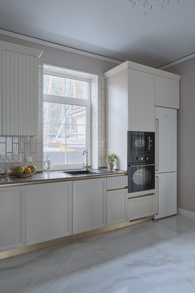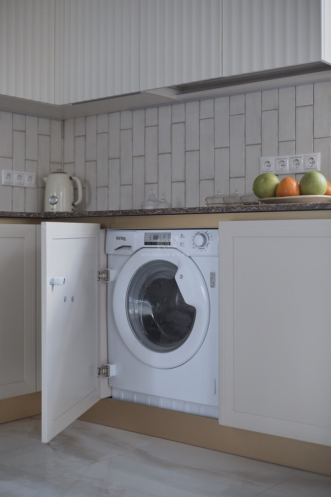 Стоит отметить, что кухня обладает внушительным объемом полезного пространства. В распоряжении хозяев – полноразмерная стиральная машина, посудомоечная машина, микроволновая печь, духовой шкаф и двухуровневая бутылочница.