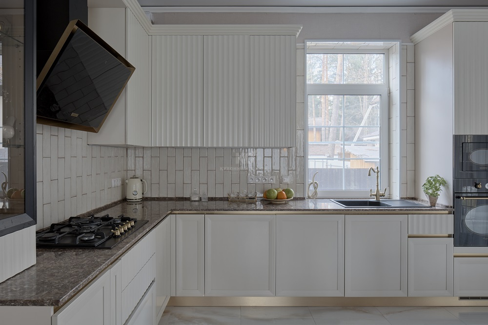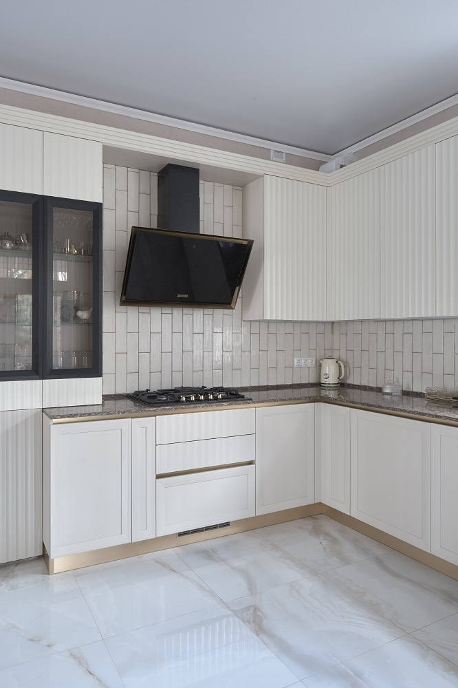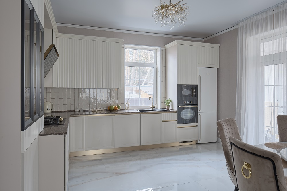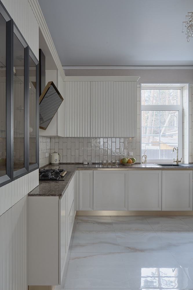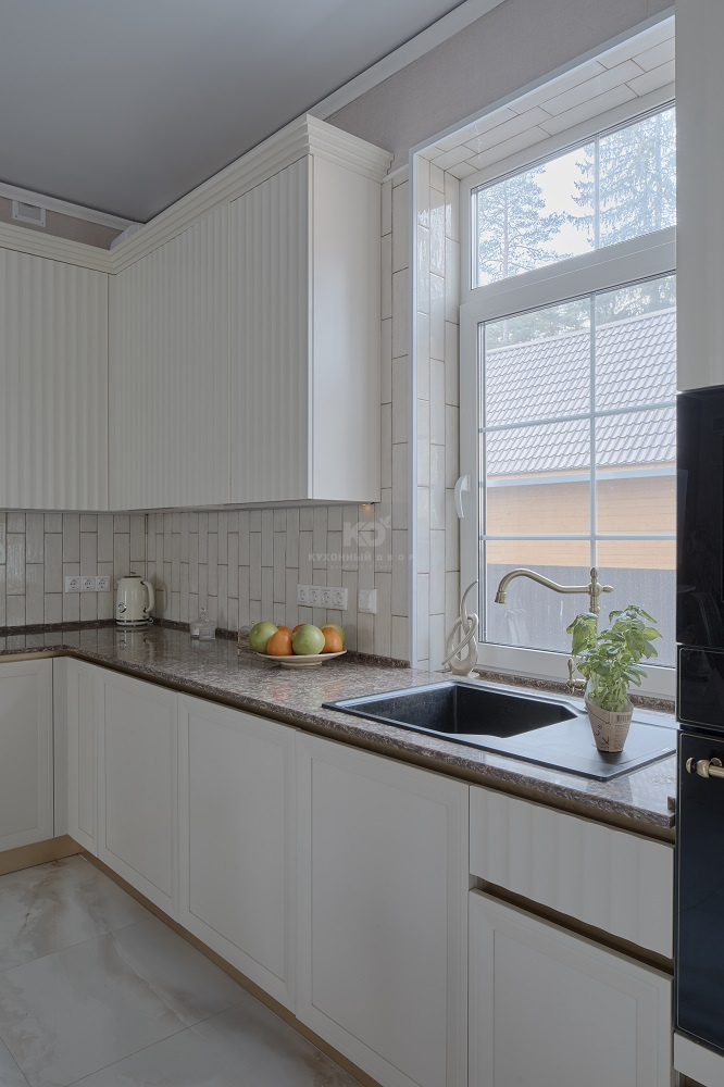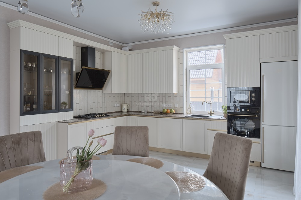 Выразительные рамочные фасады выполнены из износостойкого, прочного и безопасного материала МДФ. Эффектная вертикальная фрезеровка – эксклюзивное дизайнерское решение. Оно придает кухне динамичности и зрительно увеличивает высоту потолков. Навесные шкафы утоплены вглубь и гармонично вписываются в общую композицию.