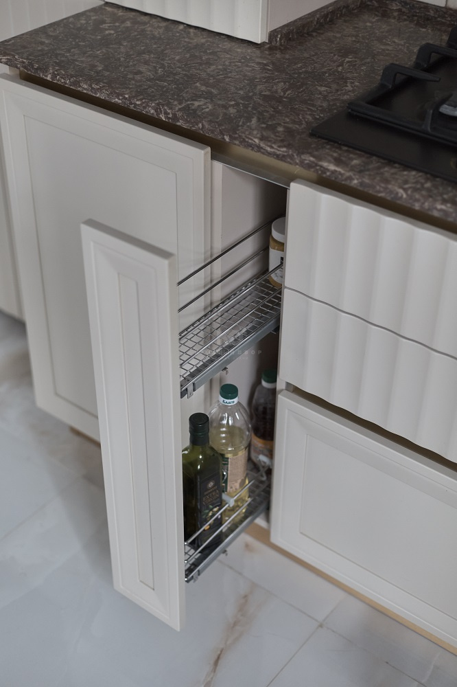Функциональность и практичность – еще одна выигрышная сторона модели «Патриция». В столешницу из устойчивого к царапинам кварца врезана мойка из искусственного камня – это дополняет композицию и облегчает процесс приготовления кулинарных шедевров.