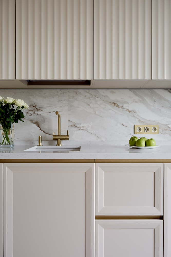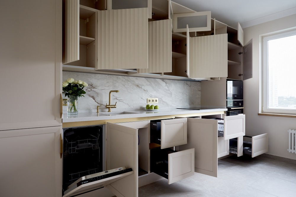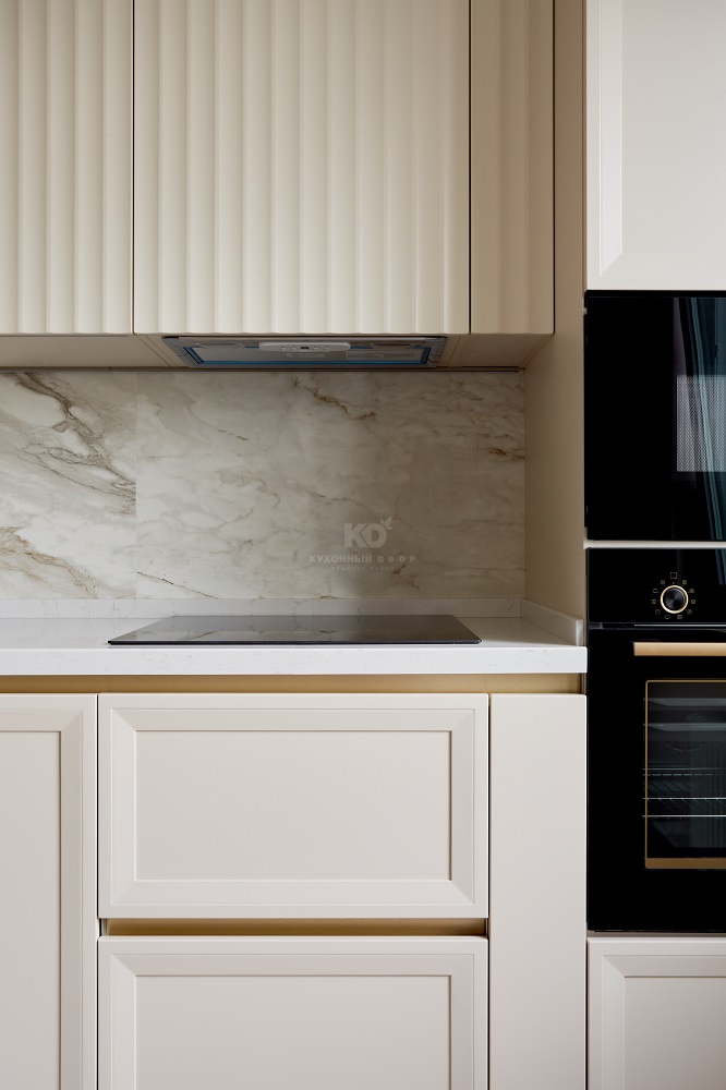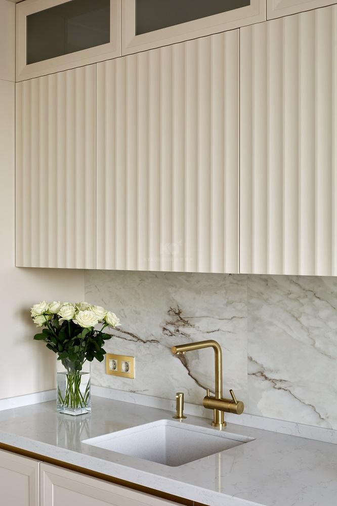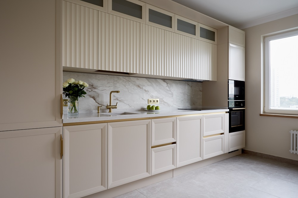 Ну и как не упомянуть систему открывания фасадов «Space Line» со скрытыми ручками-профилями под золото? Система «Space Line» визуально приподнимает столешницу над нижним ярусом, а также создаёт дополнительный акцент на некоторых ящиках. Кажется, будто кухня создана рукой талантливого скульптора – настолько она фактурна и притягательна!