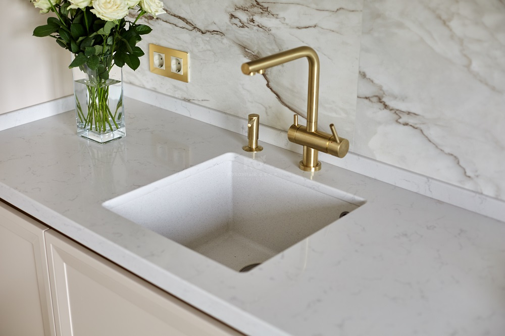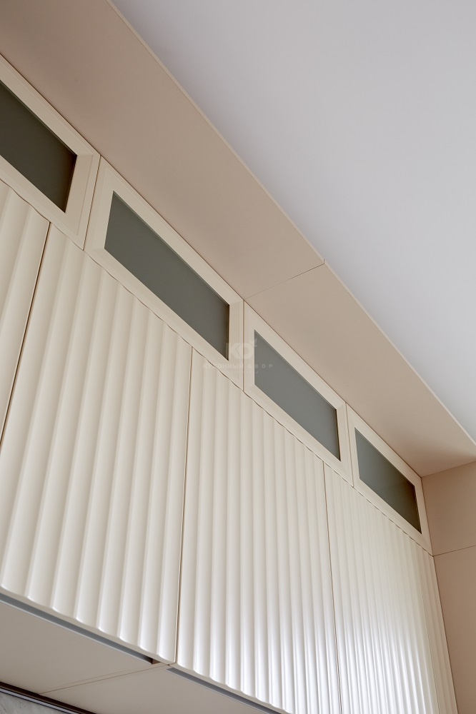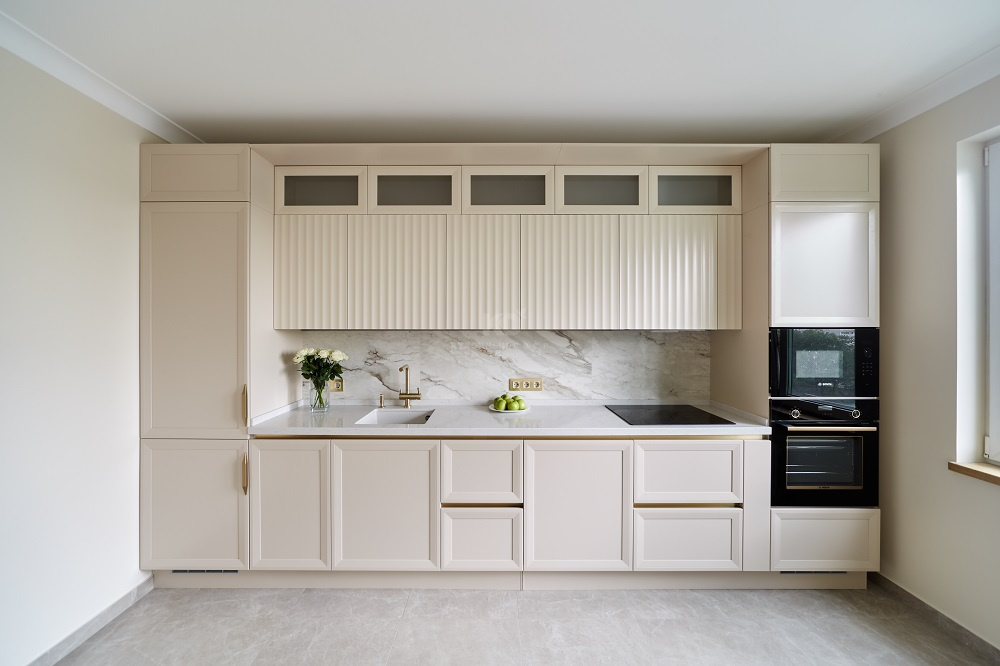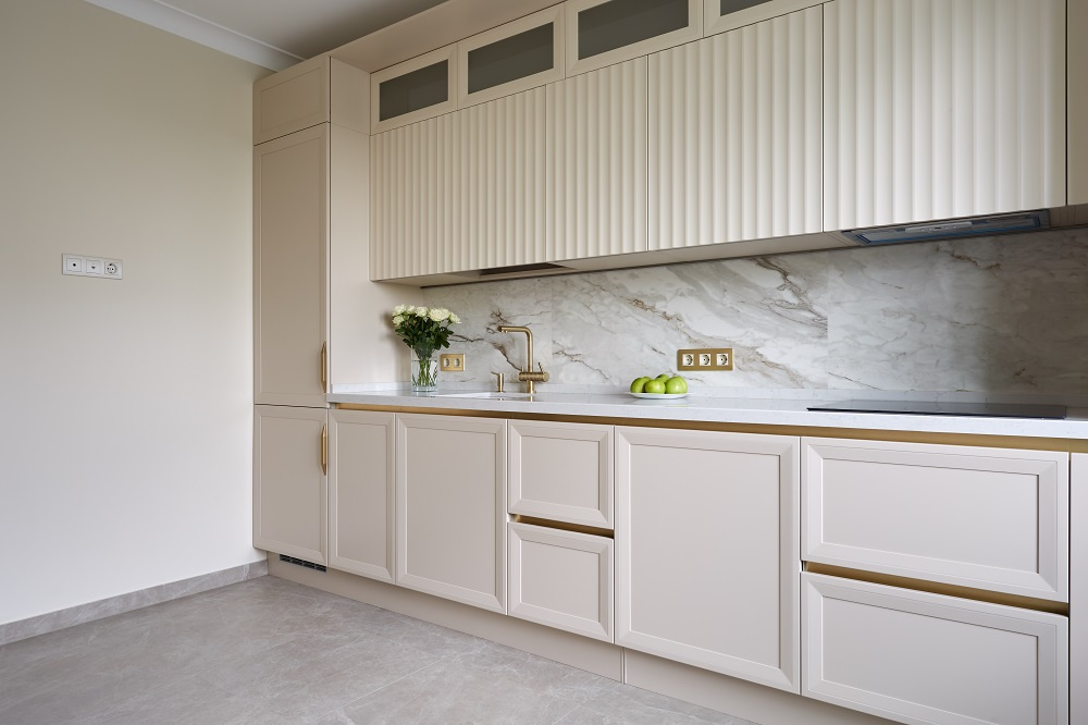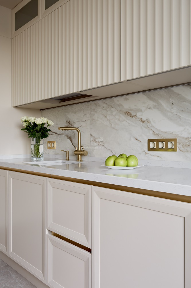 Ну и как не упомянуть систему открывания фасадов «Space Line» со скрытыми ручками-профилями под золото? Система «Space Line» визуально приподнимает столешницу над нижним ярусом, а также создаёт дополнительный акцент на некоторых ящиках. Кажется, будто кухня создана рукой талантливого скульптора – настолько она фактурна и притягательна!