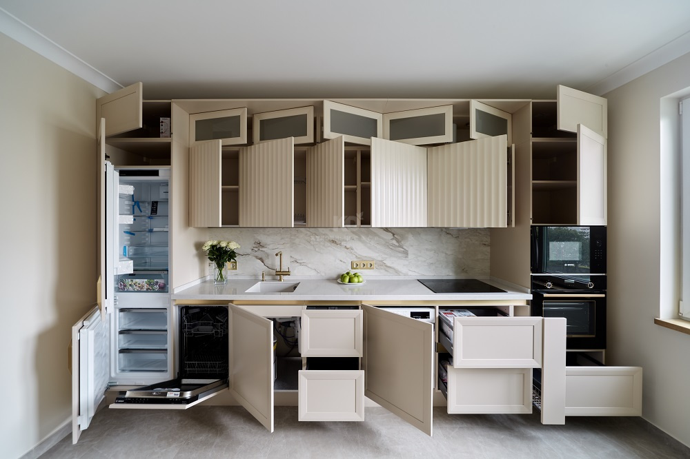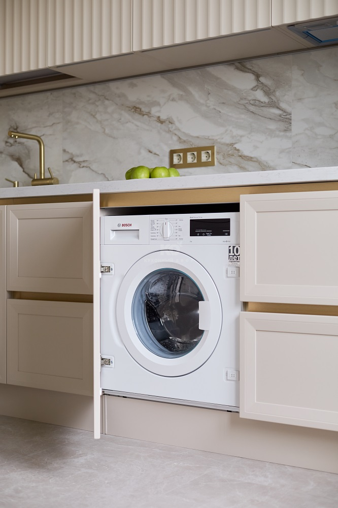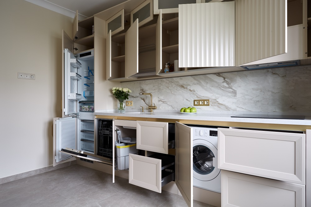 Функционал. Одной фактурностью сыт не будешь, поэтому «Патриция» хороша и по части функционала. Несмотря на «воздушную» внешность, кухня велика и невероятно вместительна. В распоряжении хозяев внушительный объём полезного пространства, а также аксессуары и современная техника. Внутри нашлось место даже для полноразмерной стиральной машины! Модная, привлекательная, прекрасно оснащённая – «Патриция» создана дарить комфорт и радовать глаз!