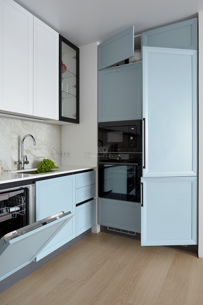 Один из главных – мода на нежное, и вместе с тем, эффектное сочетание оттенков. В этой «Патриции» прекрасно скомбинированы белый и голубой цвета. А подчёркнута эта небесная палитра грамотным добавлением чёрных акцентов. Вы наблюдаете их в технике, а также в алюминиевых рамках застеклённых зон и в ручках-профилях системы открывания «Спейс Лайн». Система «Спейс Лайн, к слову, не только придаёт гарнитуру выразительности, но и визуально «приподнимает» столешницу, делая её изящной и утончённой.