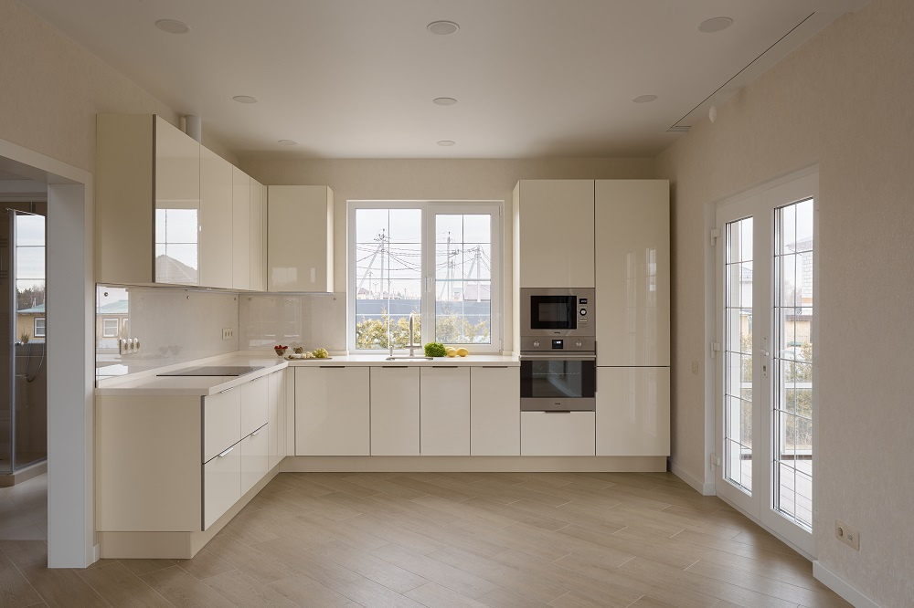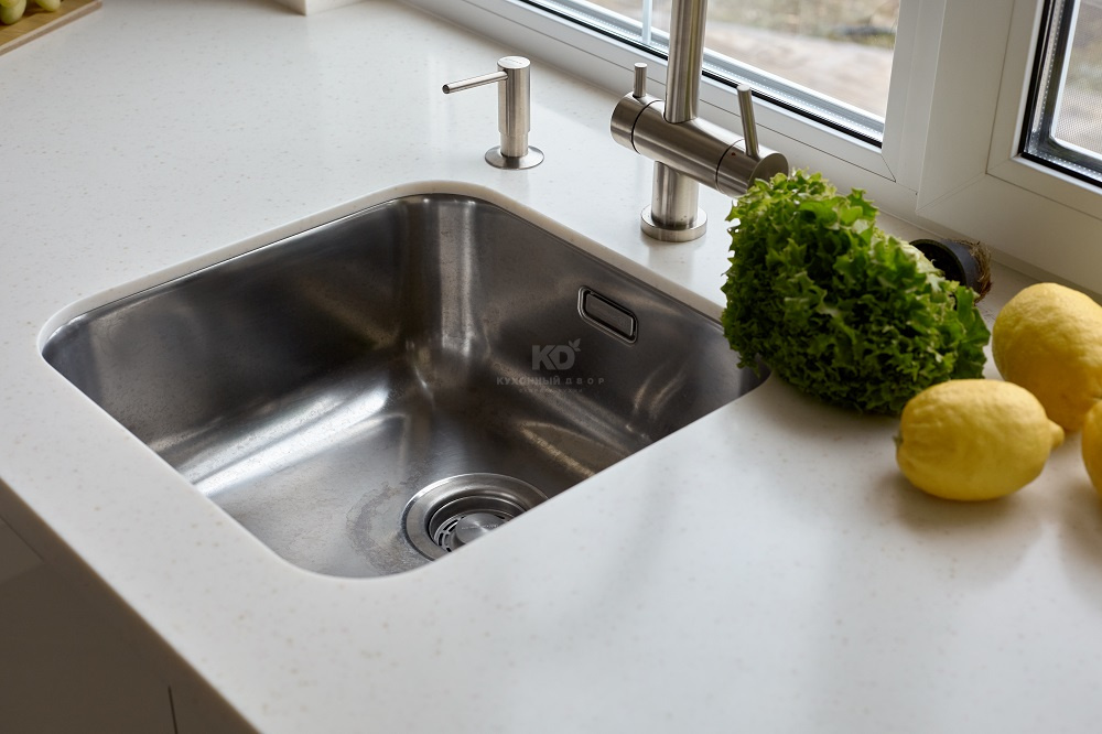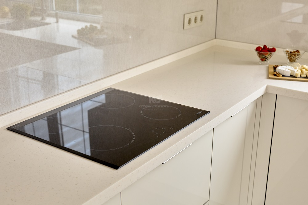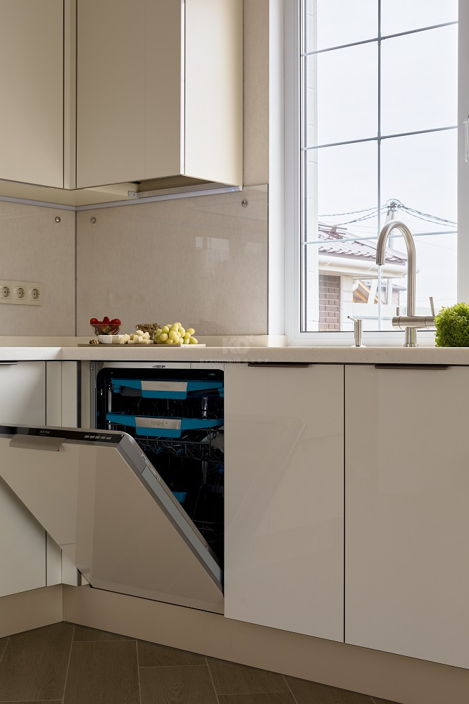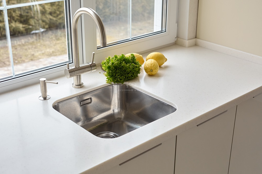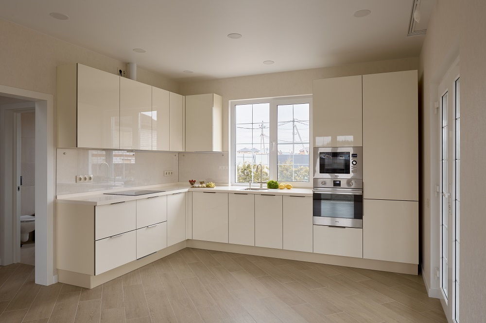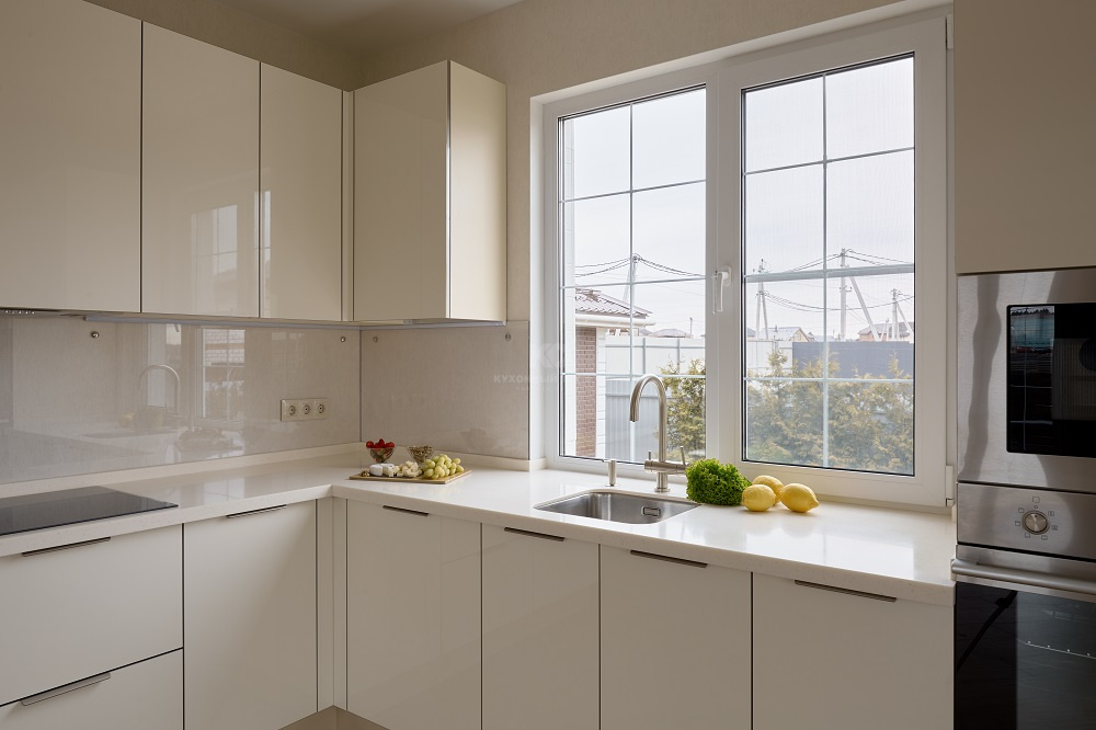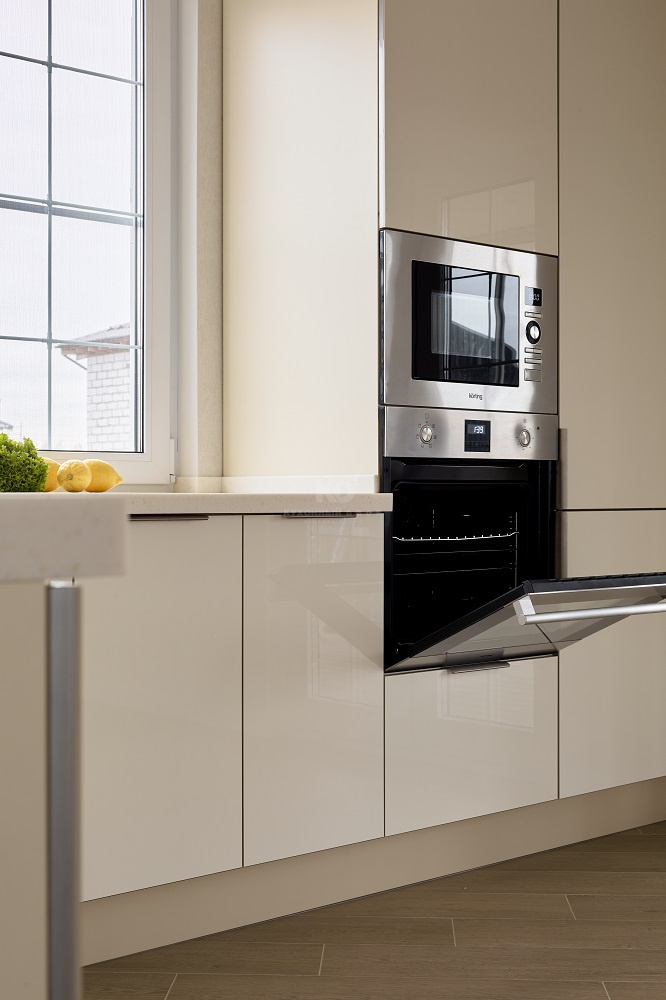 Нижний ярус «Рины» оснащён лаконичной лицевой фурнитурой, а шкафы верхнего яруса не имеют ручек вовсе. Благодаря такому решению не теряется лёгкость всего образа. А ещё кухня имеет эргономичную Г-образную форму и превосходное оснащение. Здесь есть: