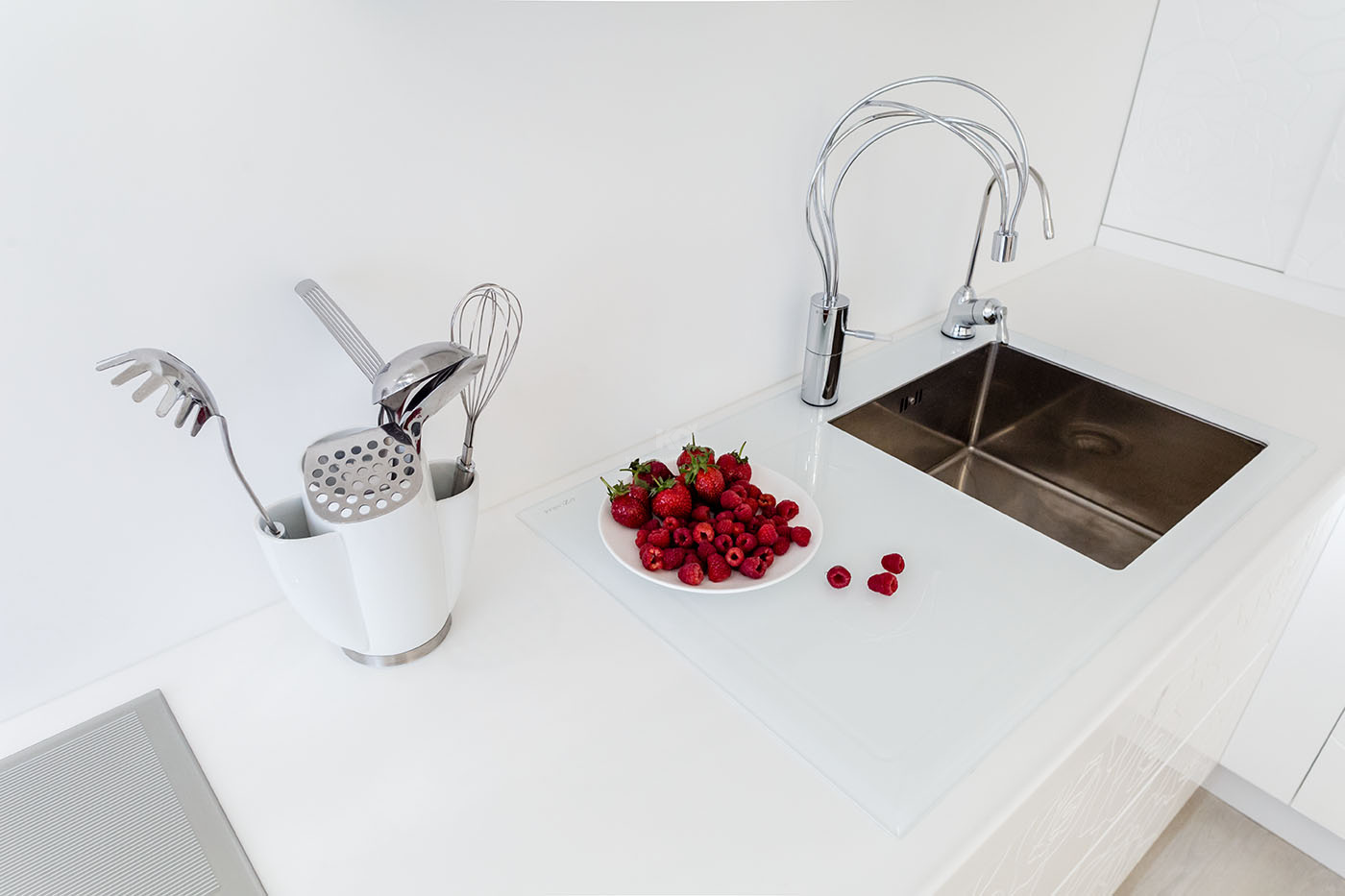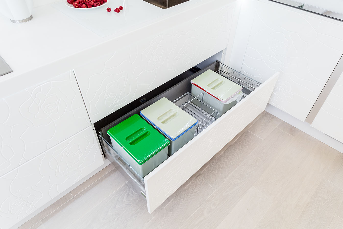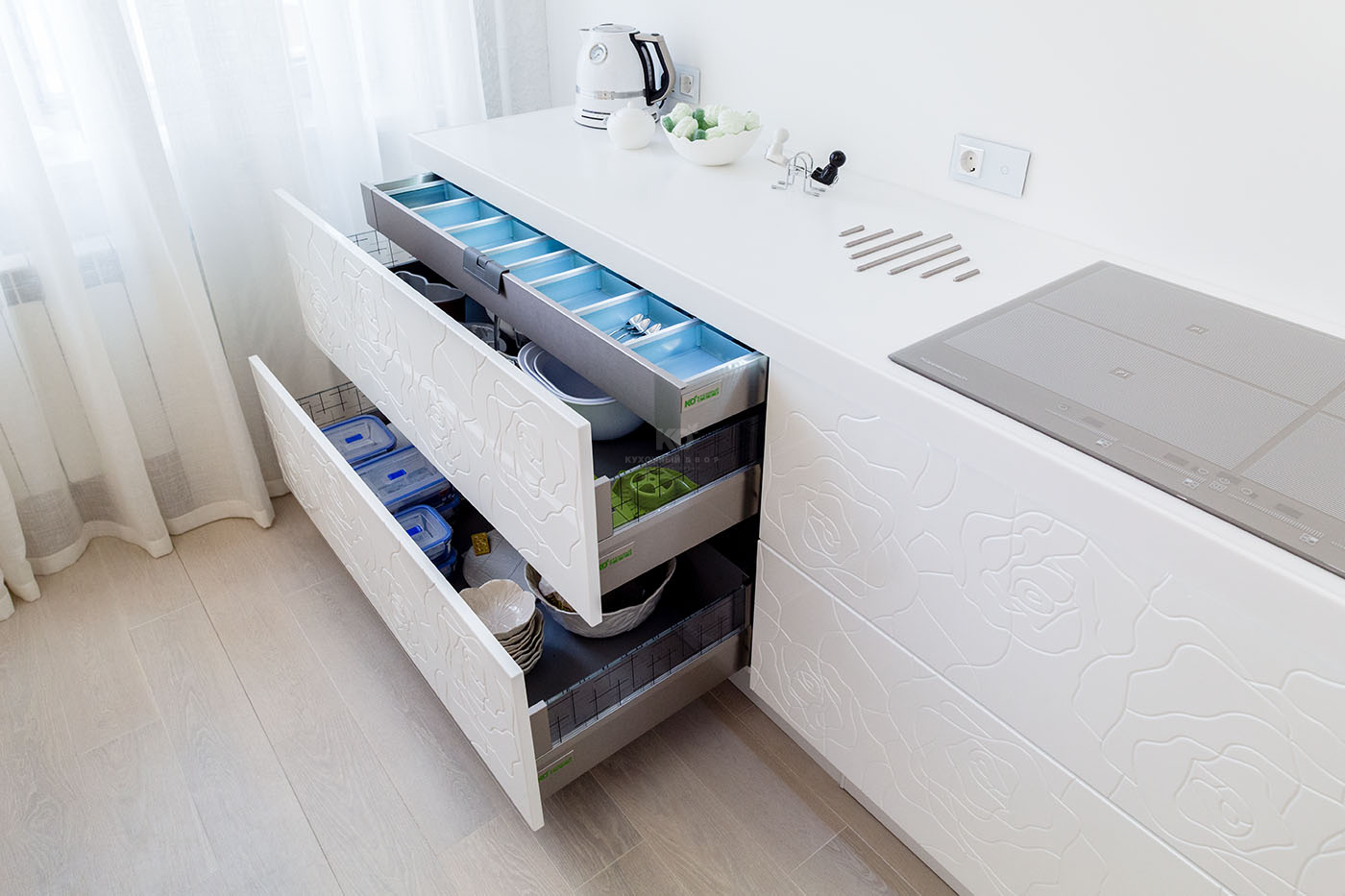 Для оформления кухни Анна выбрала пронзительно-белоснежную модель «Розали». Фасады без ручек и первоклассное техническое оснащение создали безукоризненный образ в стиле модерн. Центром композиции стала футуристическая вытяжка, оснащенная мягкой подсветкой. Ее обтекаемые формы привнесли едва уловимый контраст со строгими пропорциями модулей. Такие «призрачные» контрасты можно увидеть во многих деталях «Розали». И они делают ее неповторимой.