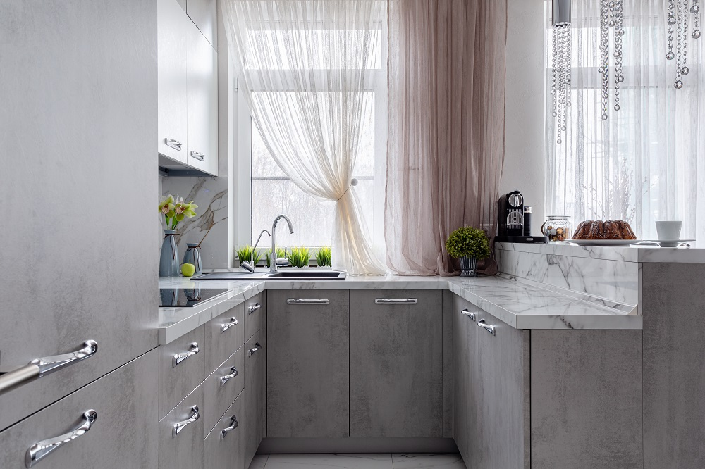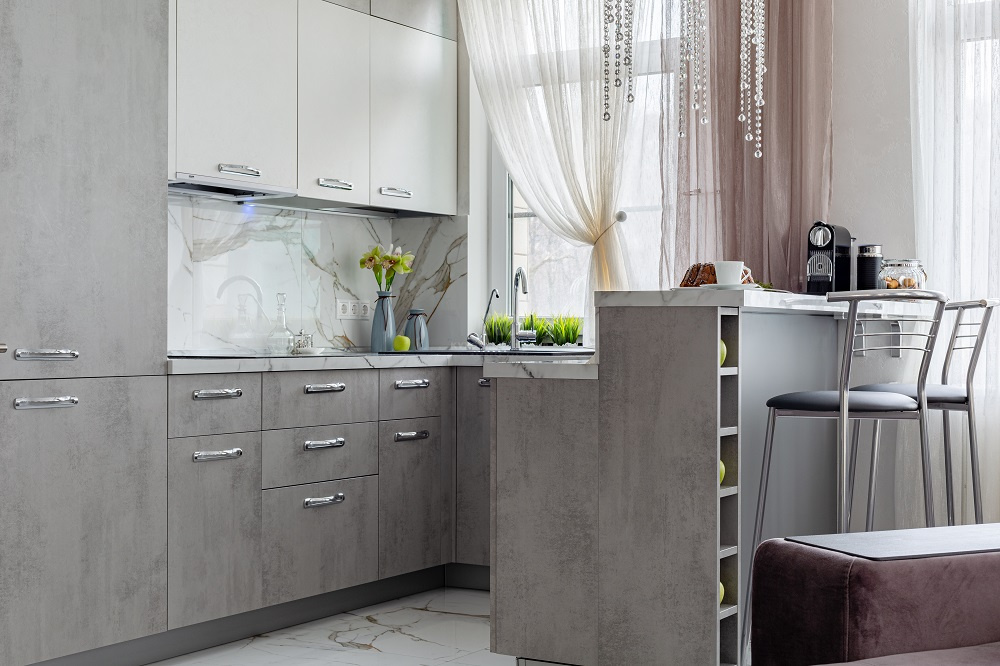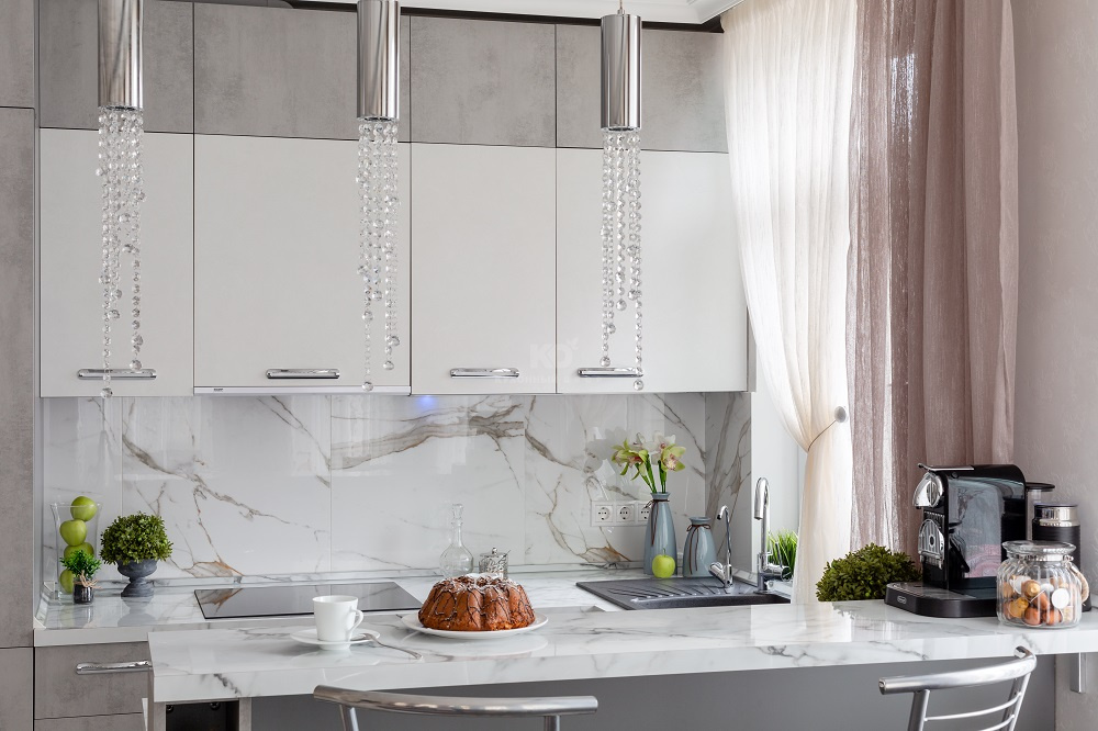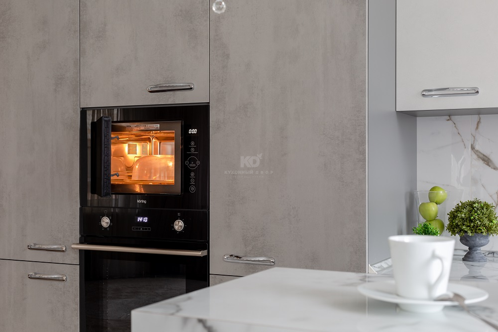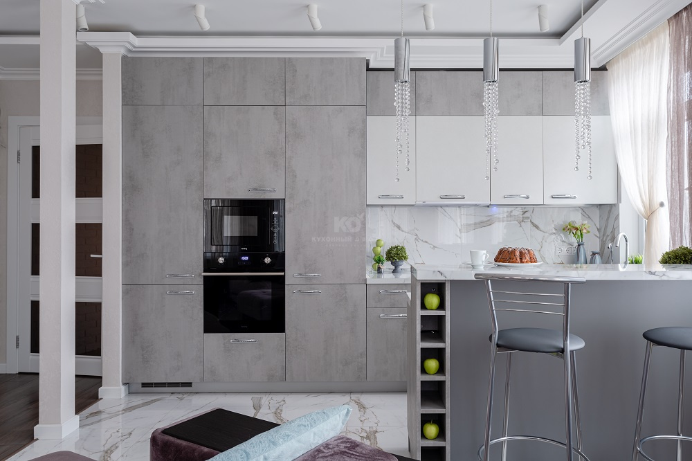 А ещё здесь безумно приятно готовить! Во-первых потому, что кухня расположена у окна и буквально купается в солнечном свете. Во-вторых потому, что она оснащена великолепным набором аксессуаров и бытовой техники. Ну и в-третьих, «Стоун» выполнен по всем канонам современной эргономики. Продукты, утварь и посуда здесь всегда под рукой! Такой и должна быть современная кухня-гостиная, где готовка и отдых приносят равное удовольствие!