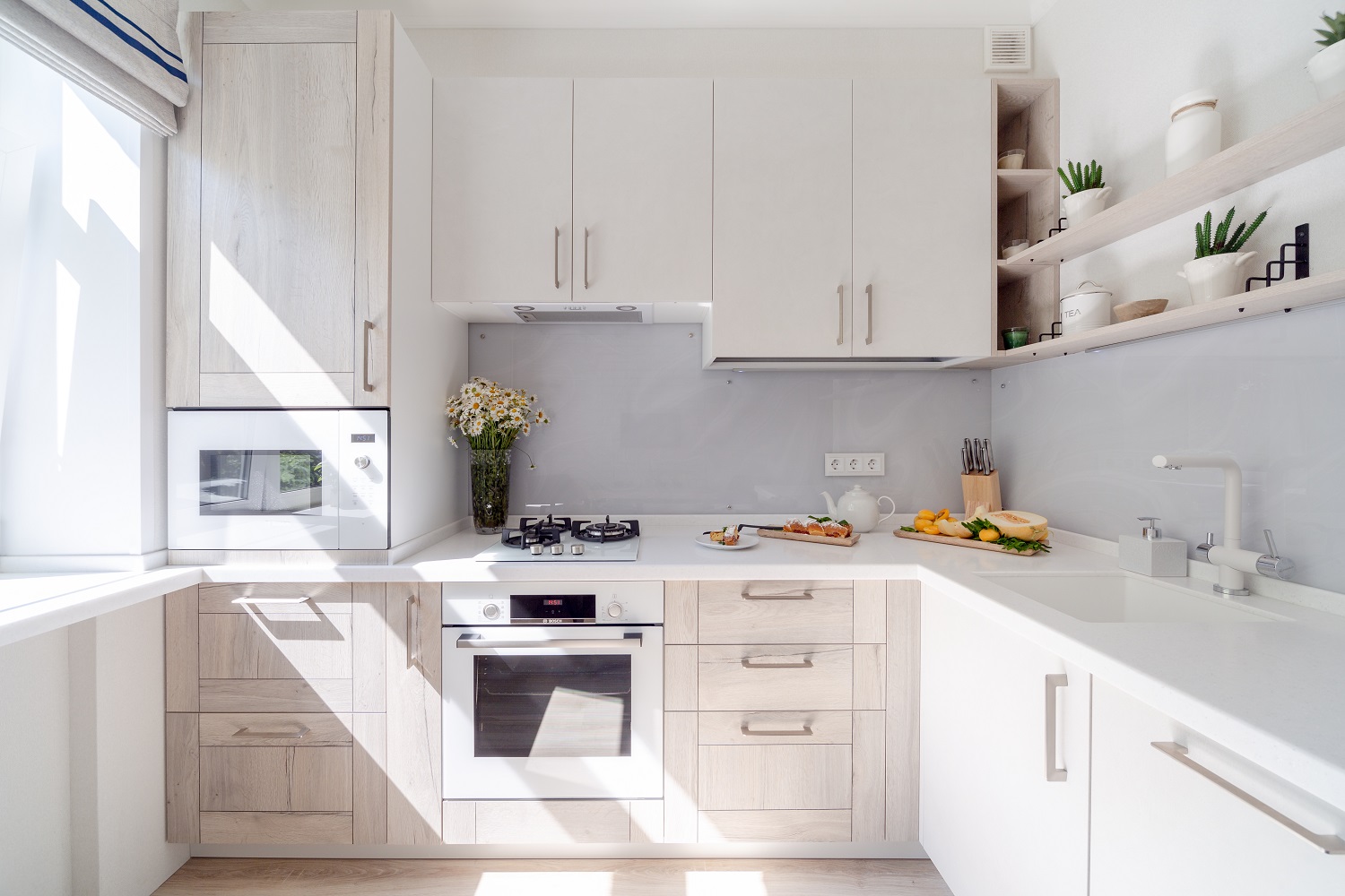 Под стать фасадам и столешница! Она создана из невероятно прочного и долговечного искусственного камня. В цвет столешницы подобрана стильная мойка и смеситель, а также вся встраиваемая техника. Здесь есть посудомоечная машина, мощная СВЧ, духовой шкаф и компактная варочная поверхность. В общем, всё, что необходимо для кулинарного творчества!