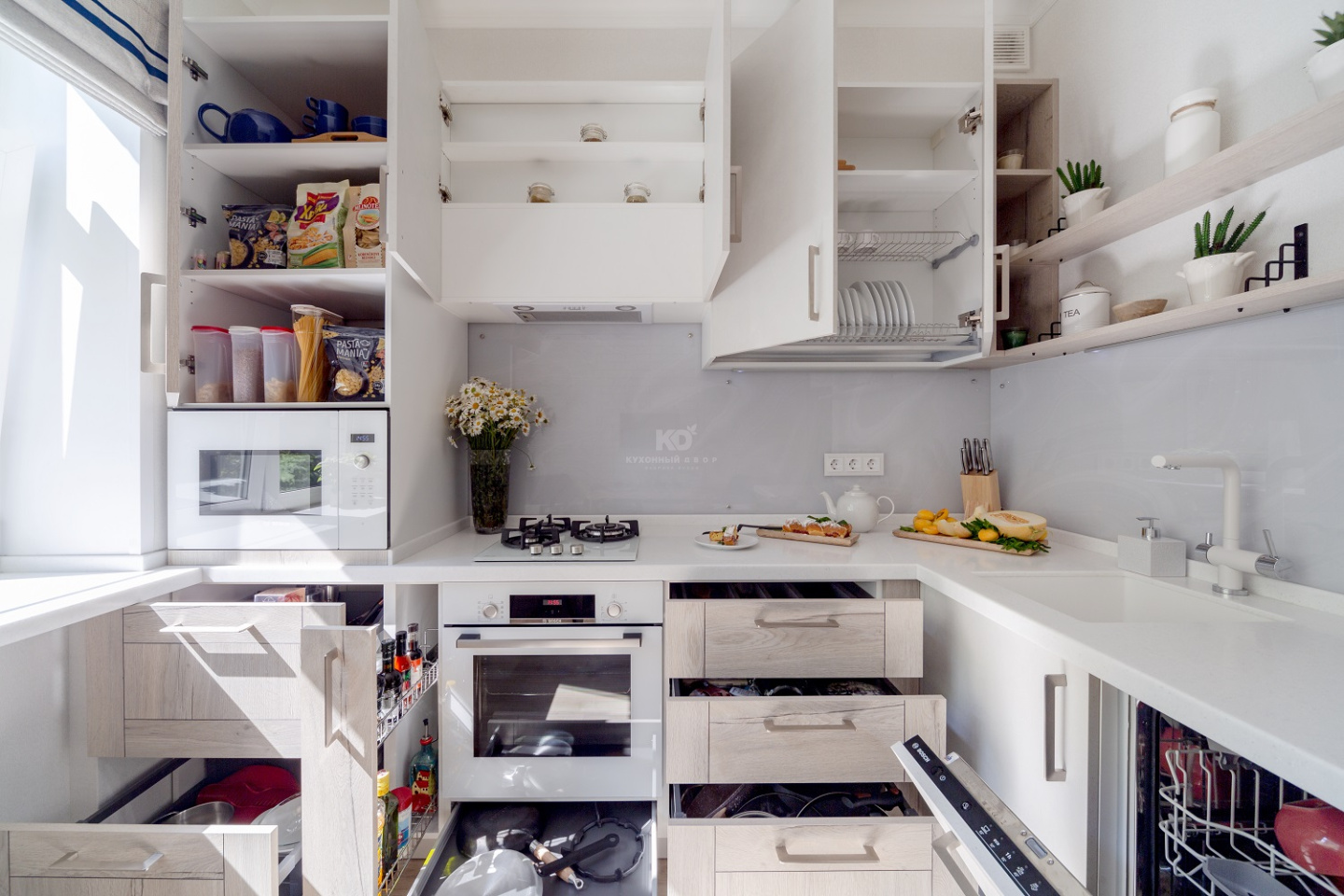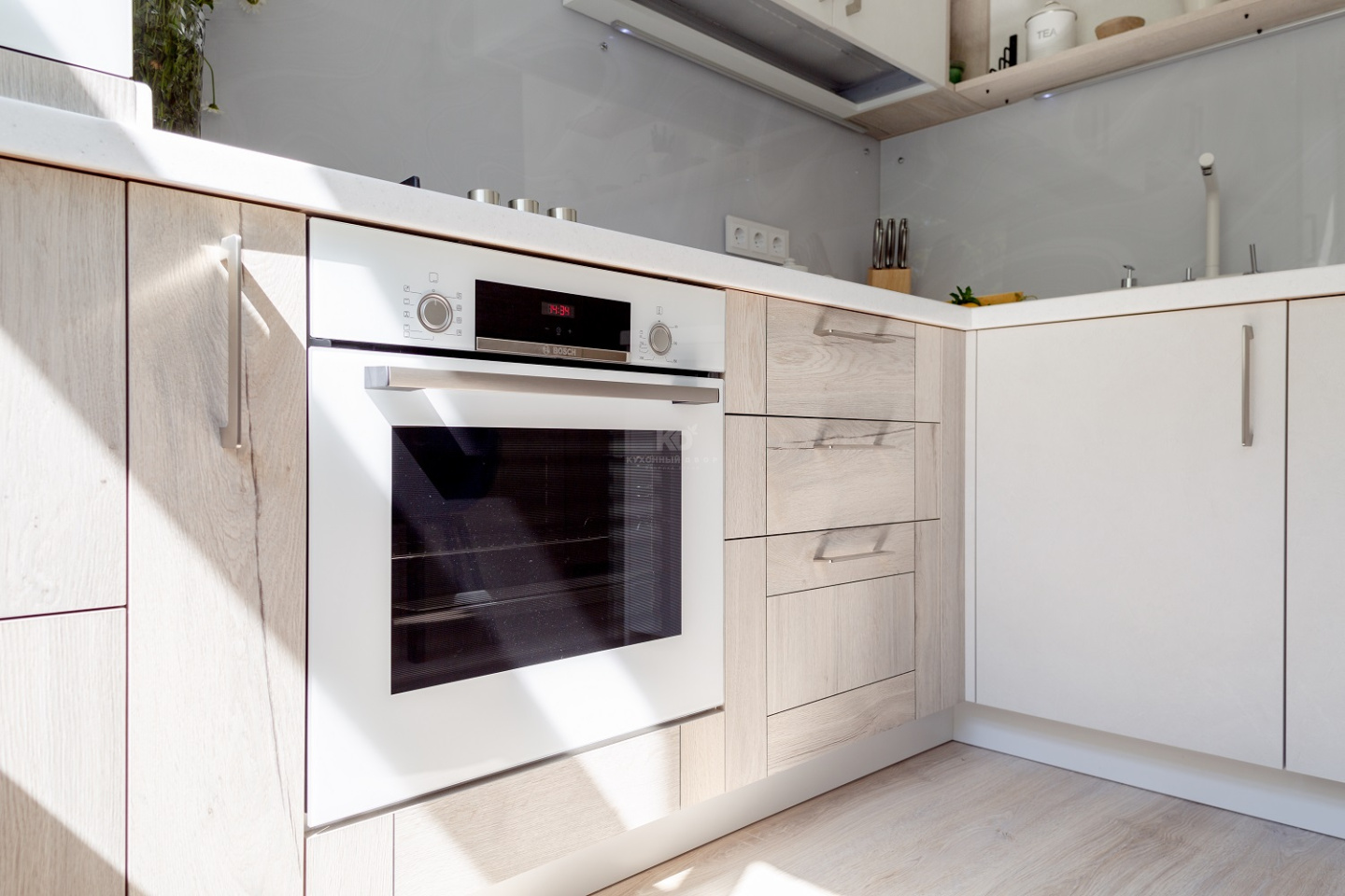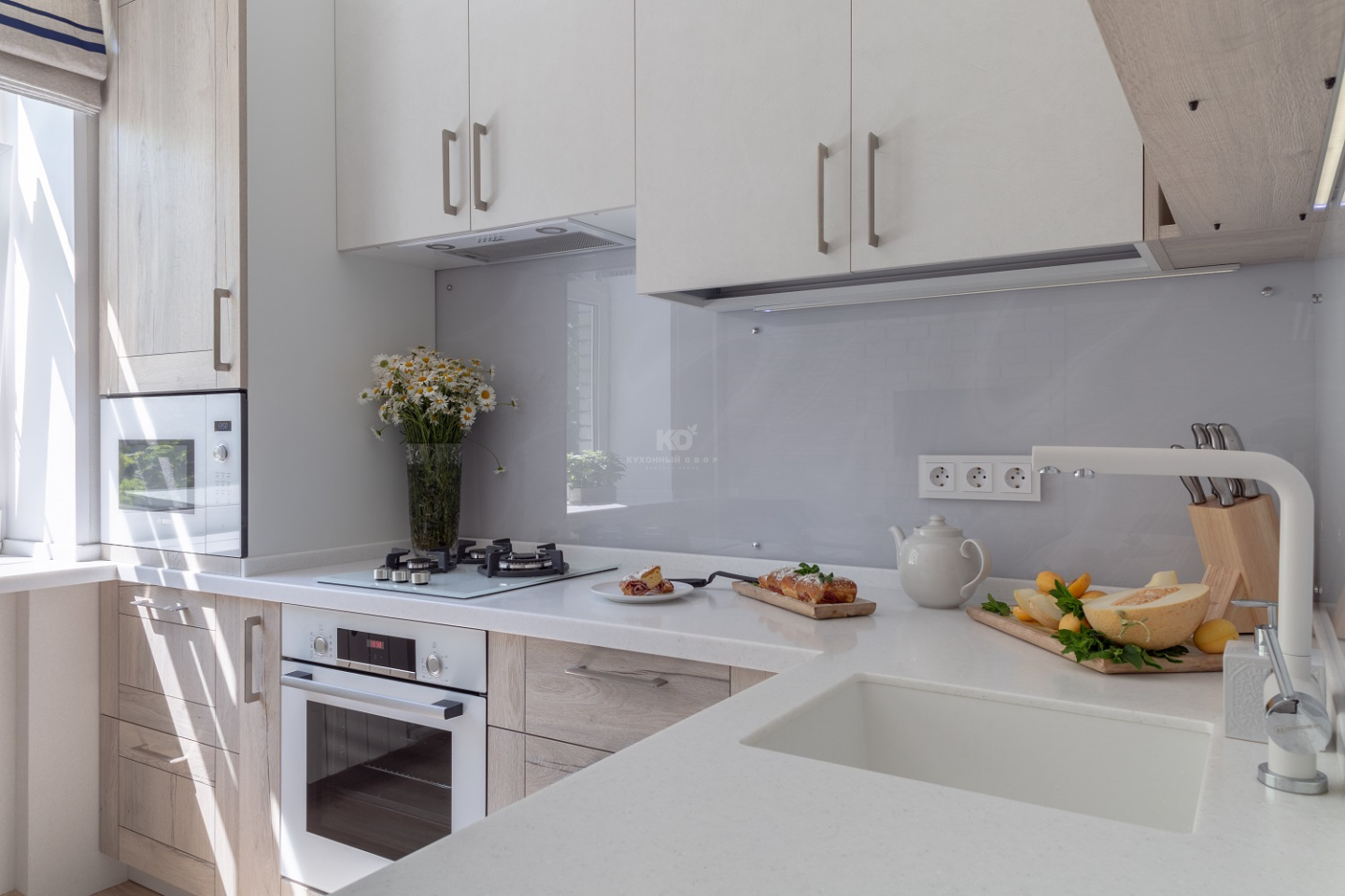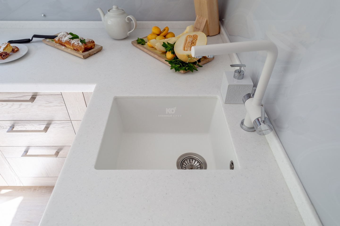Под стать фасадам и столешница! Она создана из невероятно прочного и долговечного искусственного камня. В цвет столешницы подобрана стильная мойка и смеситель, а также вся встраиваемая техника. Здесь есть посудомоечная машина, мощная СВЧ, духовой шкаф и компактная варочная поверхность. В общем, всё, что необходимо для кулинарного творчества!