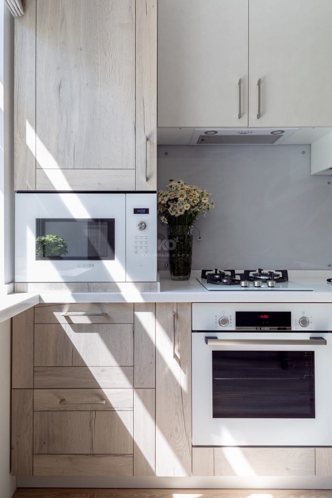 Секрет очарования здесь, прежде всего, в цветах и материалах. «Стоун Фрэйм» словно изнутри сияет белизной, а все фасады здесь выполнены из немецкой экоплиты Egger. Поверхности разные: одни имитируют древесину, другие бетон. Такое сочетание оттенков и фактур делает кухню удивительно нежной. А еще визуально расширяет окружающее пространство!