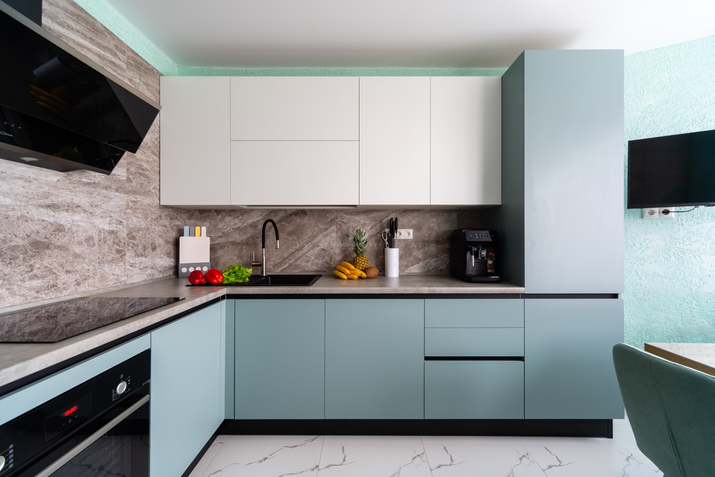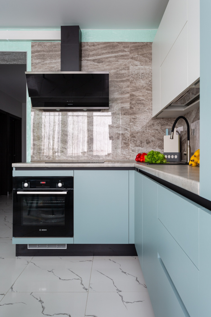 Нежно-голубая кухня в минималистичном интерьере