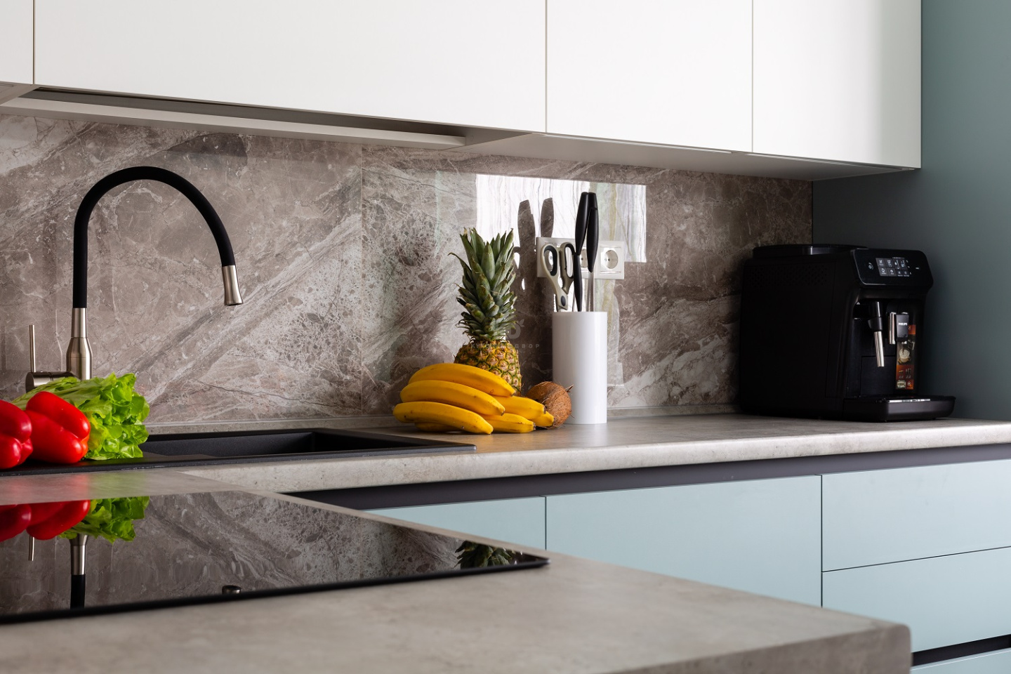 С первого взгляда на «Стоун Колор» можно понять – эта кухня очаровывает, прежде всего, своей лаконичностью. На фасадах из немецкой экоплиты Egger нет видимых ручек, и в нижнем ярусе их роль исполняют скрытые профили системы «Space Line». Они делают монолитный образ модели выразительным, подчёркивают строгие пропорции мебели, а также визуально «приподнимают» столешницу. В цвет профилей «Space Line» выполнен и цоколь, который окончательно задаёт цветовую ритмику «Стоуна».
