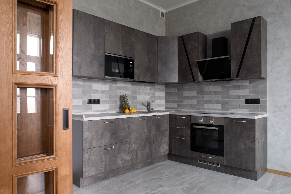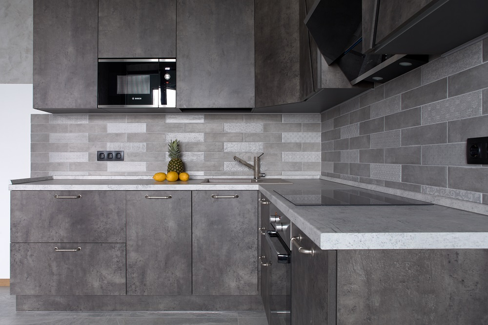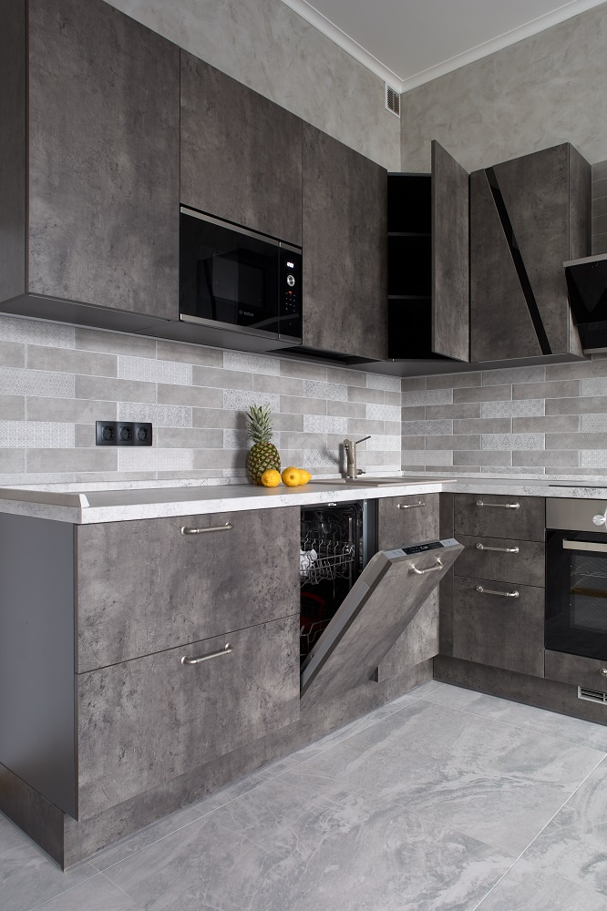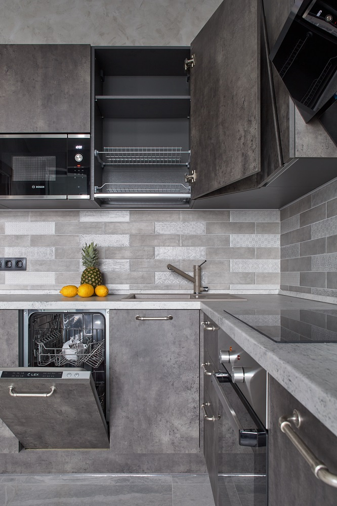 Что больше всего ценит в кухонной мебели признанный мастер актёрского искусства? Надёжность, удобство и лаконичность. Угловой «Стоун» соответствует каждой из этих ценностей! Его внешность строга, брутальна и не имеет ни единой лишней детали. Кажется, будто фасады «Стоуна» выполнены из бетона, но на самом деле это лёгкая и прочная эклоплита Egger (Германия). Материал излучает благородную уверенность, без которой не обходится практически ни одна «мужская» кухня. Впрочем, уверенность здесь не переходит в грубость, ведь мы оснастили «Стоун» парой изящных фасадов с косыми стеклянными вставками, а также светлой столешницей «Slotex» из HPL. Благодаря этим элементам гарнитур по-особому «звучит» в интерьерах, не перегружая и не загромождая их.