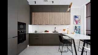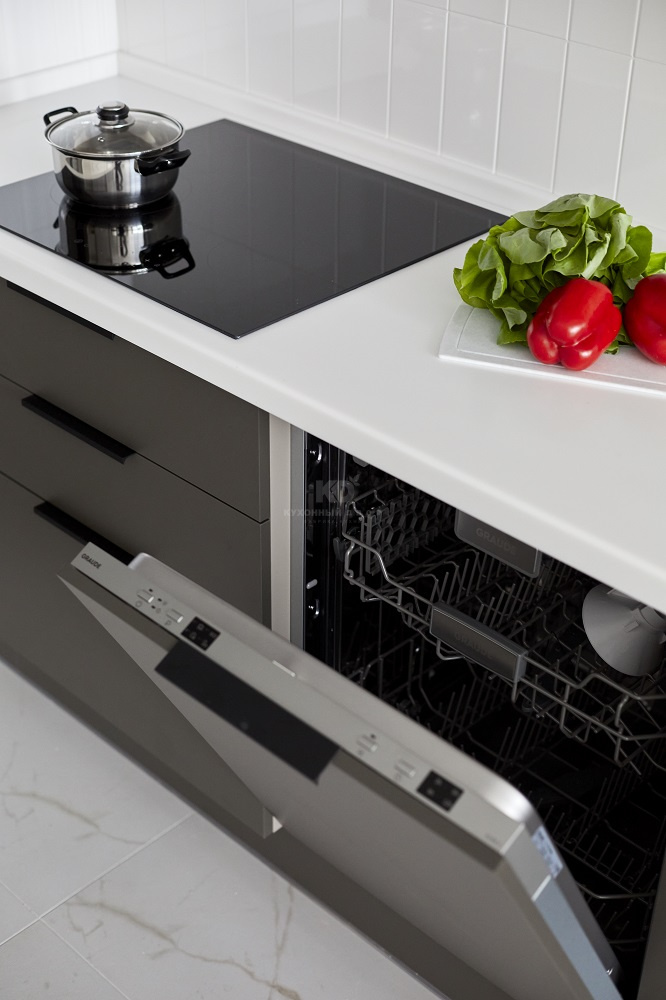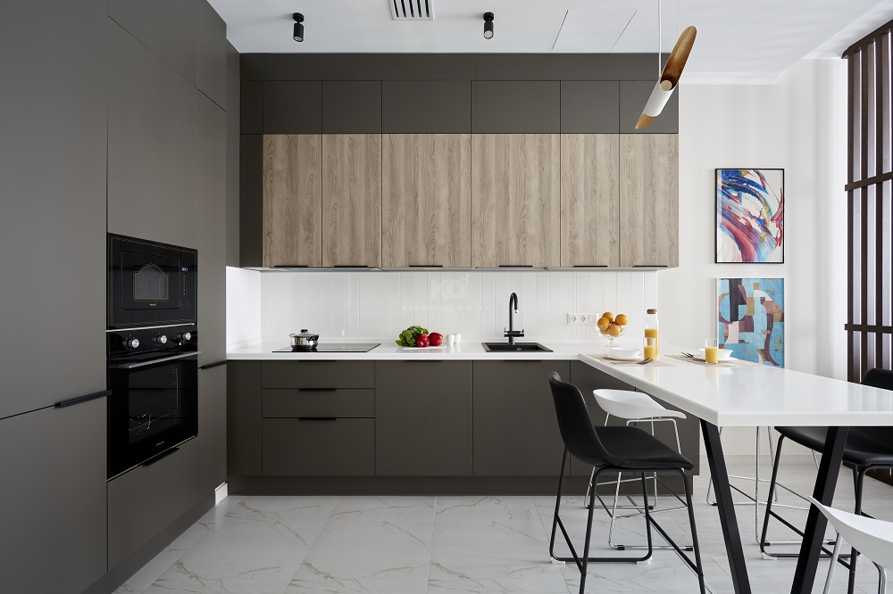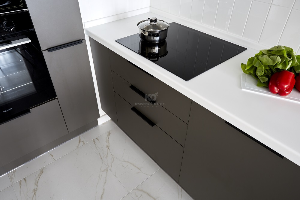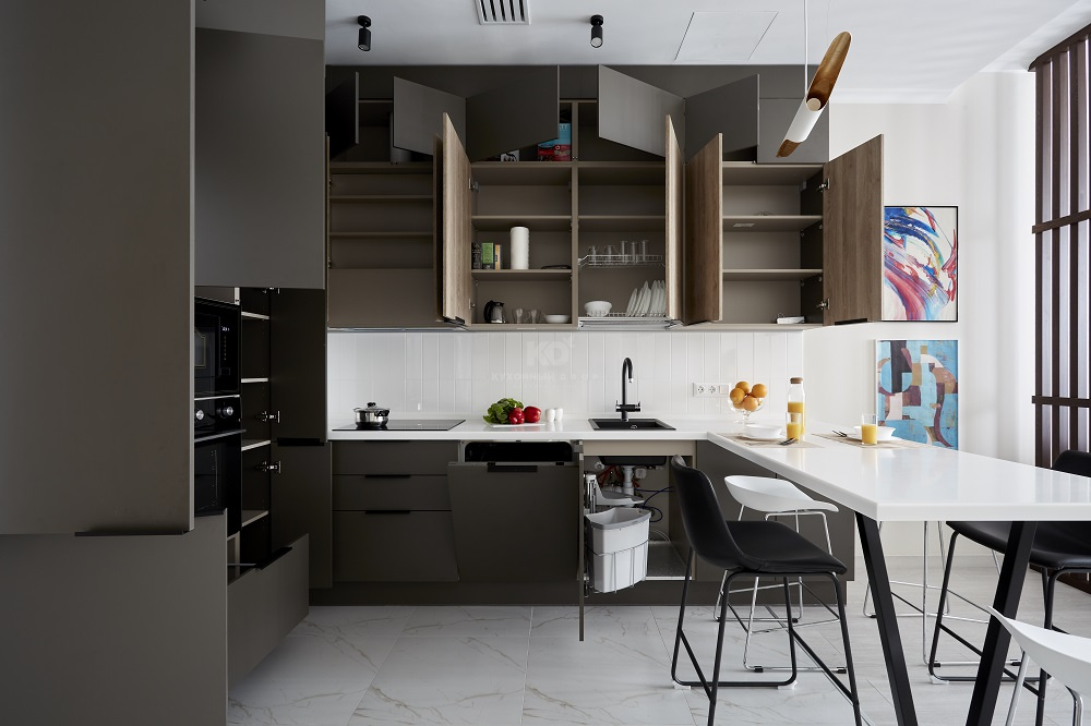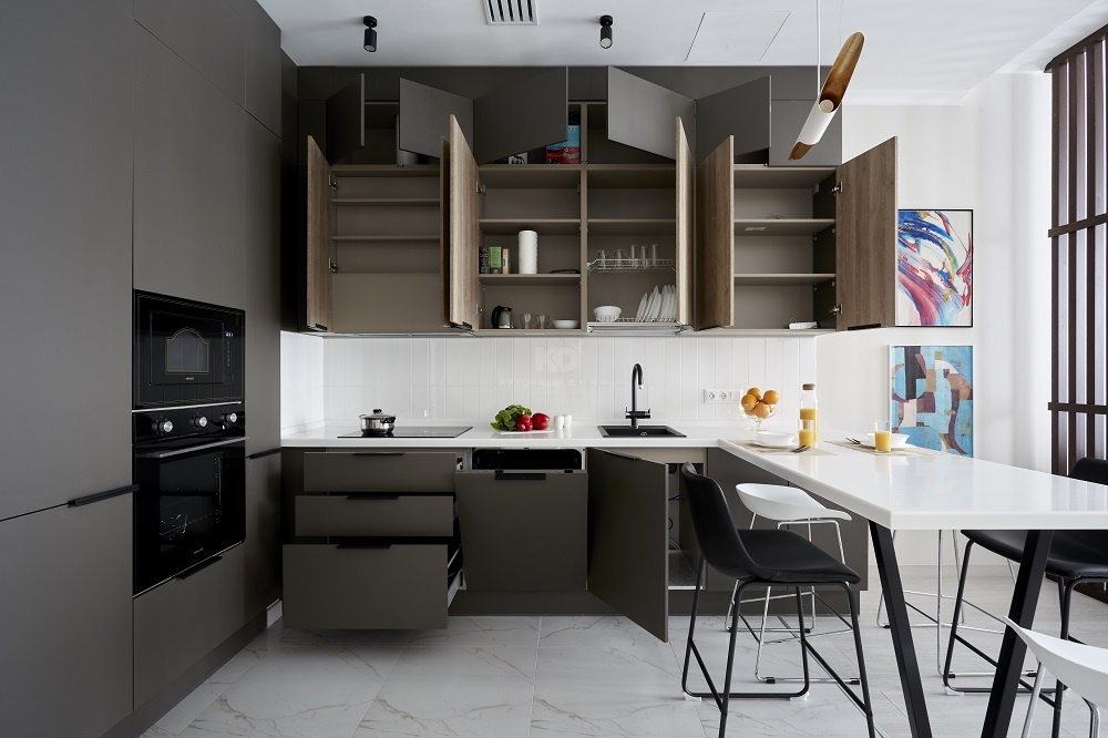 Большая П-образная графитово-белая кухня