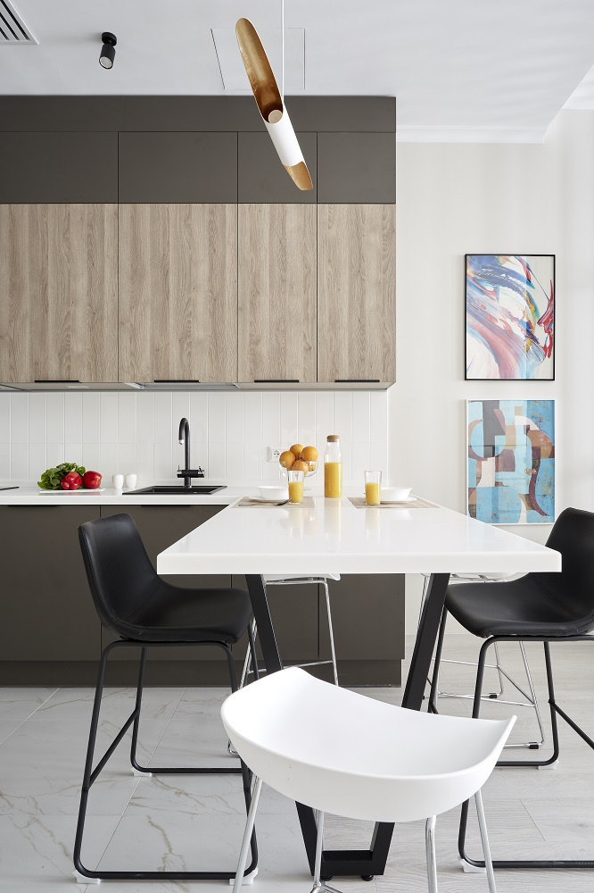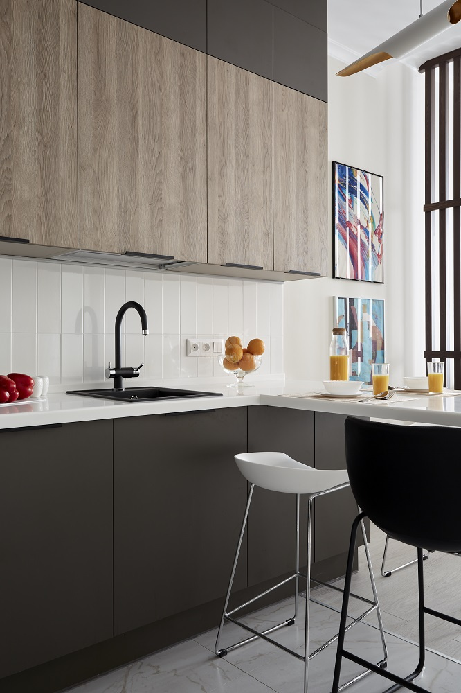 • Эргономика. Кухня выстроена П-образно, а такая архитектура идеально подходит для студии. Во-первых, дизайнеры элегантно зонировали интерьер при помощи барной стойки. Во-вторых, было соблюдено правило «рабочего треугольника»: мойка, холодильник и варочная панель здесь находятся на приблизительно равном расстоянии друг от друга. Благодаря этому хозяйка тратит гораздо меньше времени на приготовление блюд!