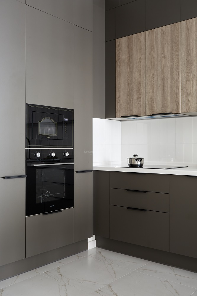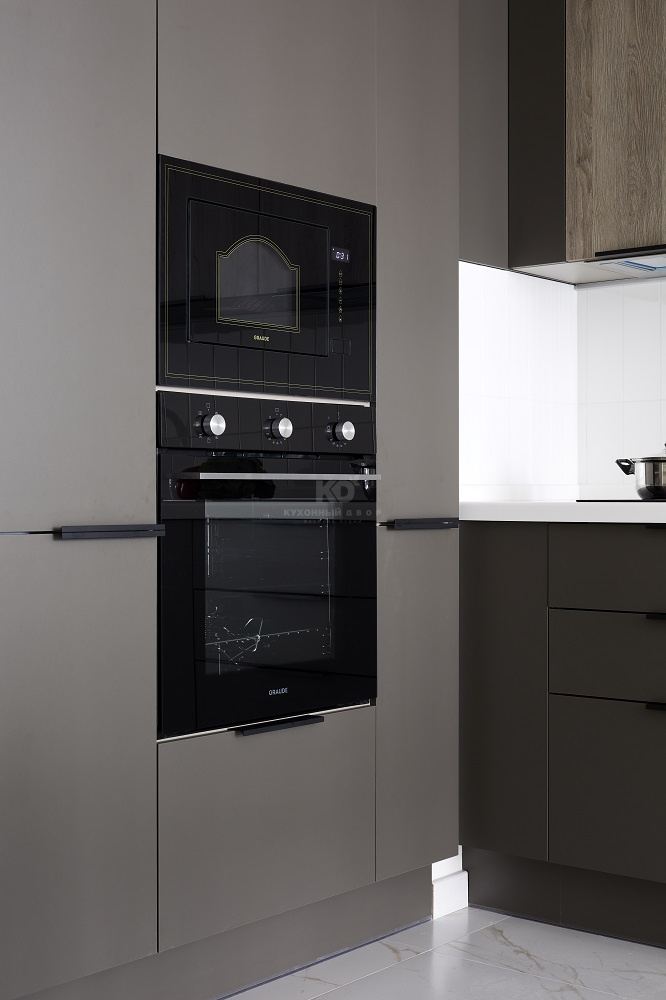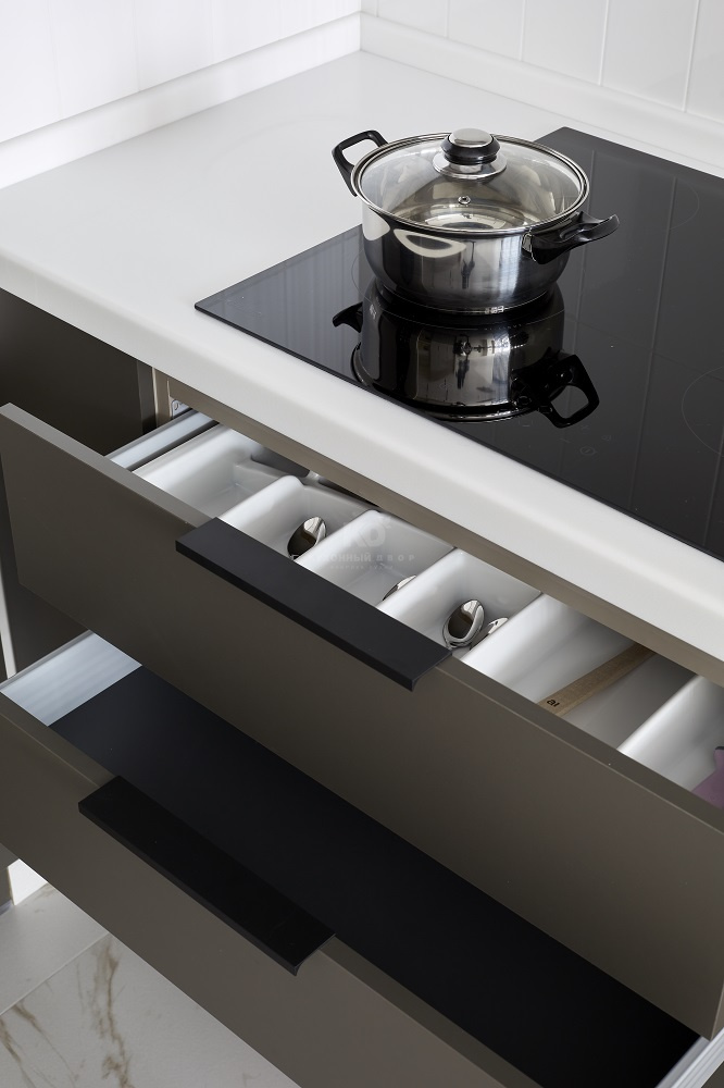 • Оснащение. Оно на высоте, что естественно для любой кухни от КД. В распоряжении «Уны» мощная скрытая вытяжка, встроенный холодильник, современная варочная панель, вместительная посудомоечная машина, СВЧ и духовой шкаф на комфортной для хозяйки высоте. Нет недостатка и в свободном пространстве – суммарный внутренний объём пеналов, шкафов и ящиков позволяет разместить огромное количество продуктов и утвари. С такой кухней хозяйке по плечу приготовление самых сложных блюд!