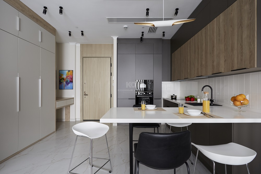 Обзор кухни с барной стойкой и антресолями для квартиры-студии