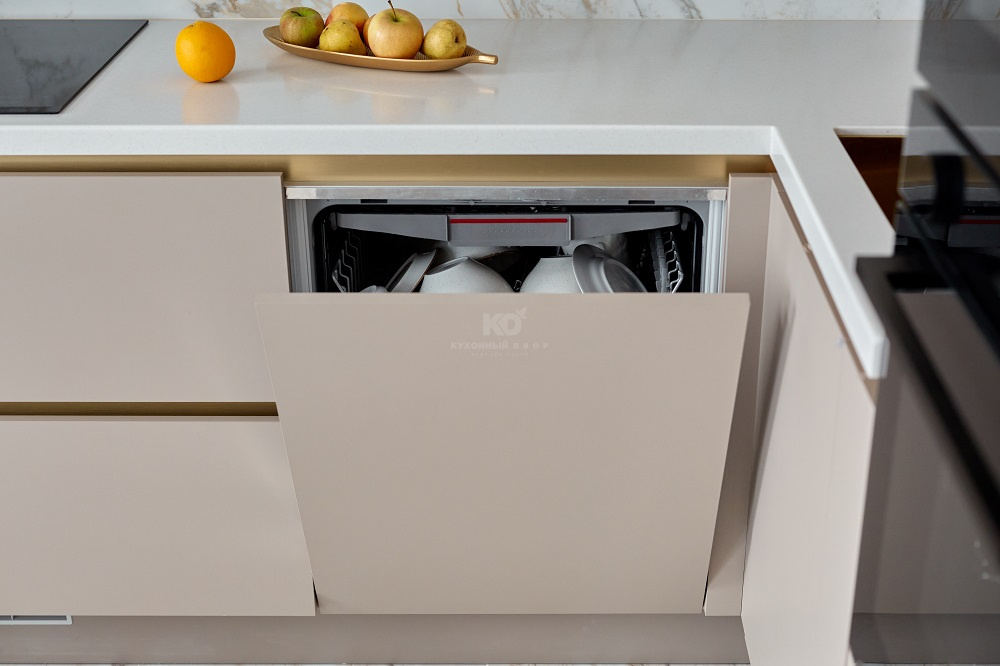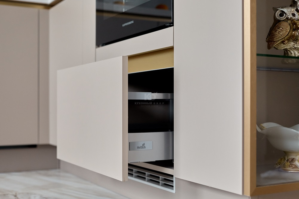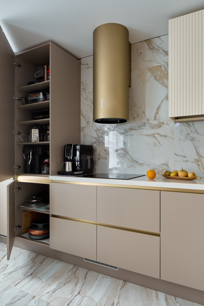 Половина? Но что тогда отвечает за другие 50%? Роскошная система открывания «Спейс Лайн» со скрытыми ручками-профилями золотого цвета. Белая столешница из искусственного камня. Выразительная цилиндрическая вытяжка в аналогичной палитре. И, конечно же, великолепный буфет с LED-подсветкой, размещенный в торцевой части одной из пенальных групп! Каждый из этих элементов добавляет огромное количество очков выразительности в «карму» проекта. Без них гарнитур был бы просто красивым. С ними же он становится исключительным!