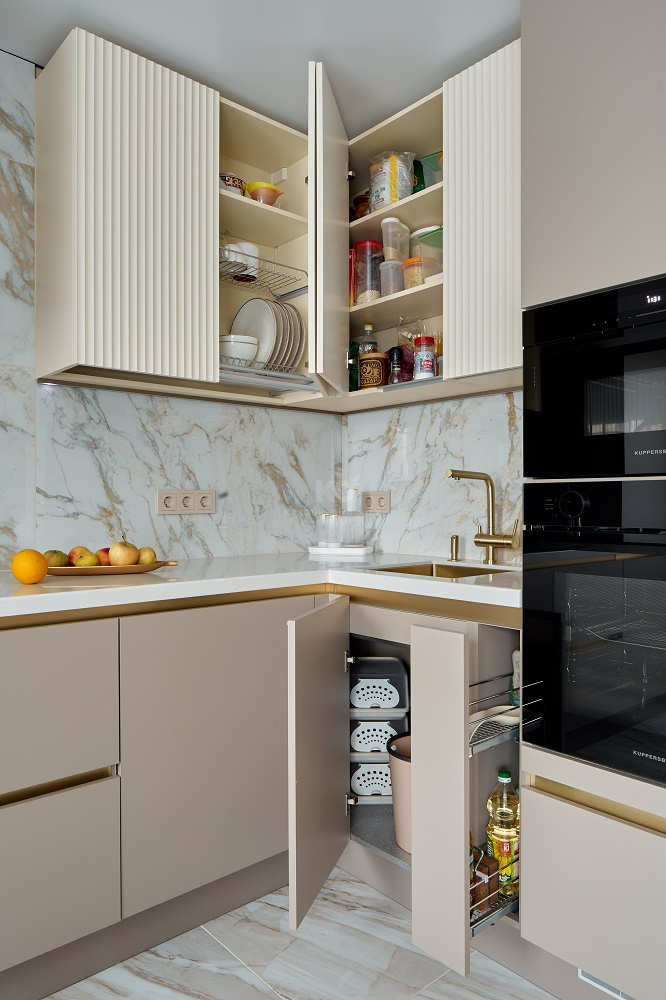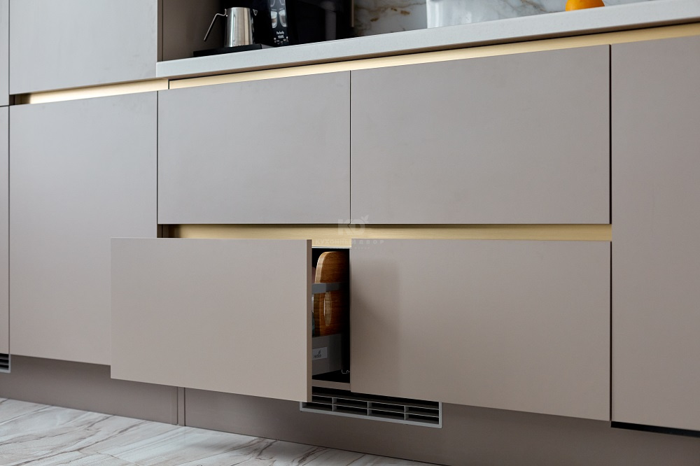 Первое, что бросается в глаза – это палитра, наполняющая интерьер уверенностью, спокойствием и неповторимым чувством «лакшери». Молочный, белый и цвет «серый камень» прекрасно сочетаются с «золотыми» и «мраморными» акцентами, а гладкие фасады гармонируют с поверхностями, имеющими вертикальную фрезеровку. Гладкие фасады созданы из немецкой экоплиты Egger, а фрезерованные – из МДФ, покрытой экомембраной. В них заключена добрая половина благородной эстетики гарнитура!