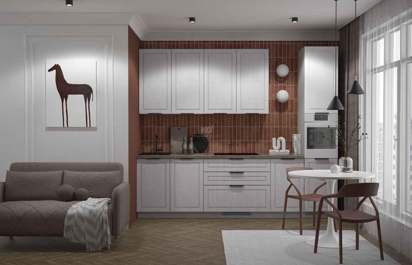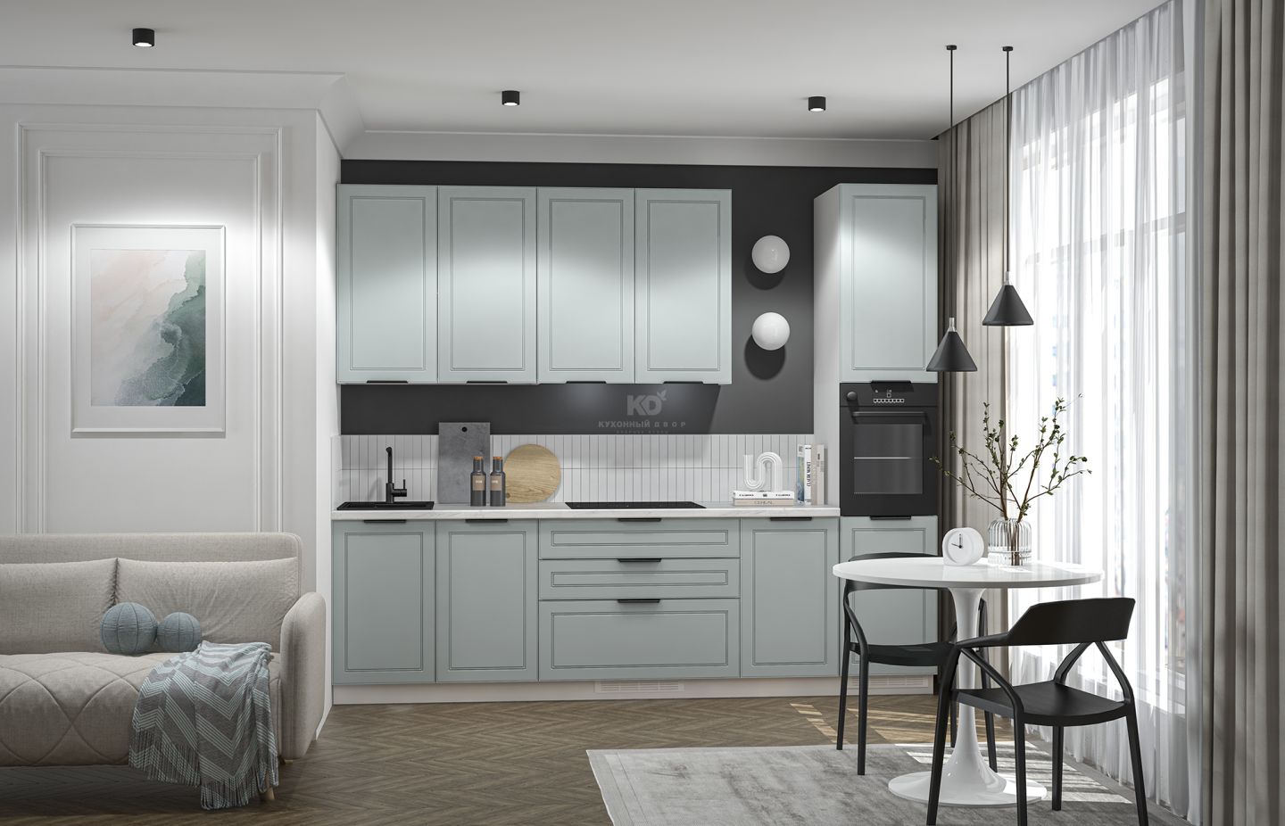 Фасады Леи изготовлены из МДФ, покрытой экомембраной в технологии 3D-окутывания без кромок, что обеспечивает устойчивость к механическим повреждениям и долговечность. Они приятны на ощупь и придают интерьеру благородный, сдержанный вид. В комплектацию входят все необходимые элементы, включая столешницу, фурнитуру и пеналы для встроенной техники. Итог — чистота линий и максимум полезного пространства при визуальной компактности.