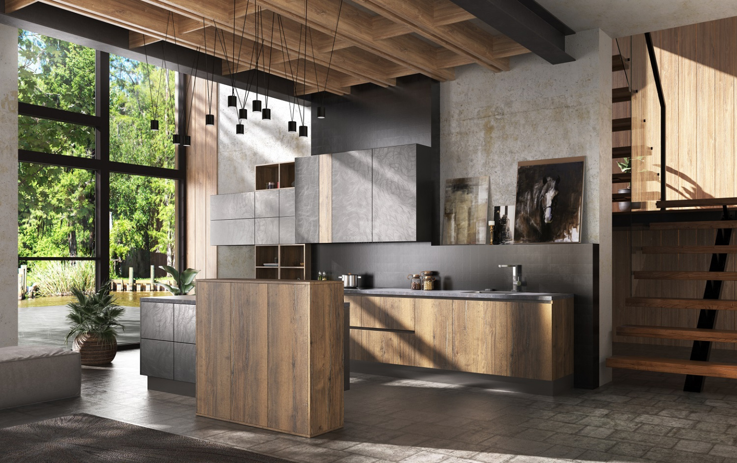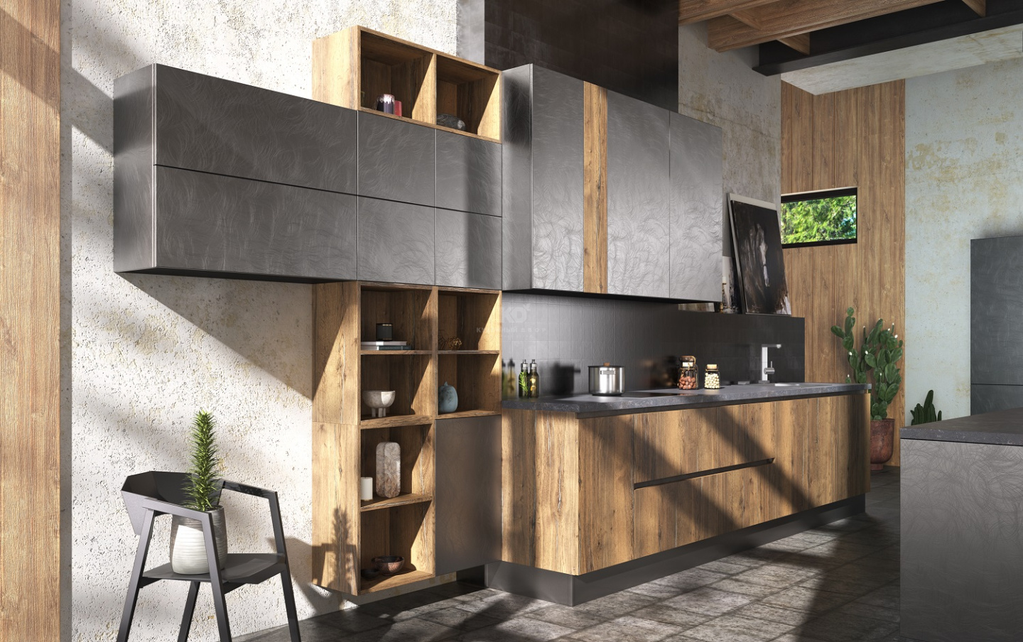 Он проявляет сдержанность и стальной характер, она же настаивает на теплых нотках в интерьере… Есть даже третий в этой истории, но он равнодушно наблюдает за ними со стороны. Нет, это не семейная драма, а история о том, как современная тенденция дизайна «дерево — металл — бетон» была воплощена в новой модели «Эмма Металл». Дизайнеры «KD-Lab» нашли смелое решение — объединили черты двух моделей сразу — кухни «Стоун Вуд» и кухни «Эмма». Получился гарнитур для интерьера в индустриальном стиле.