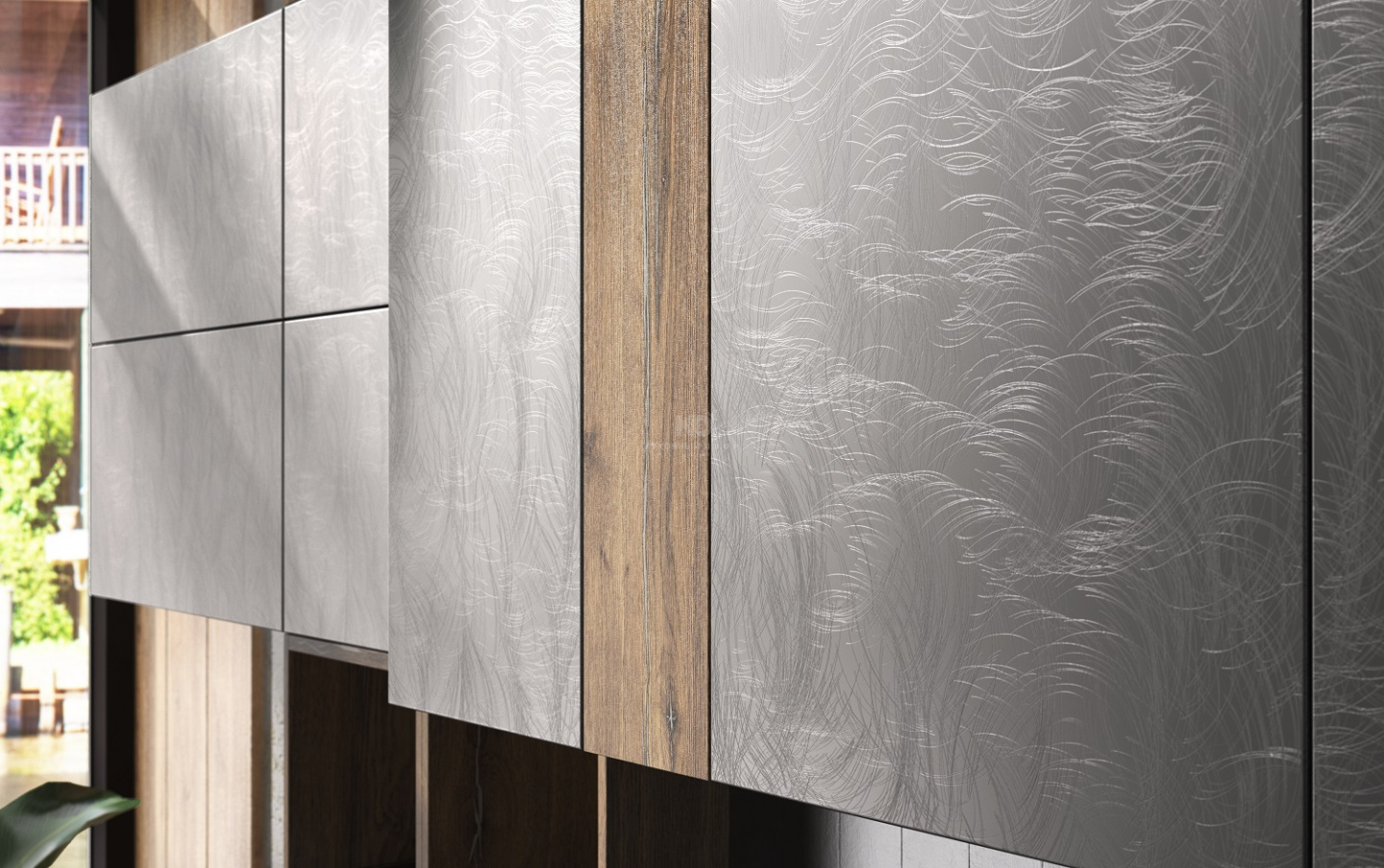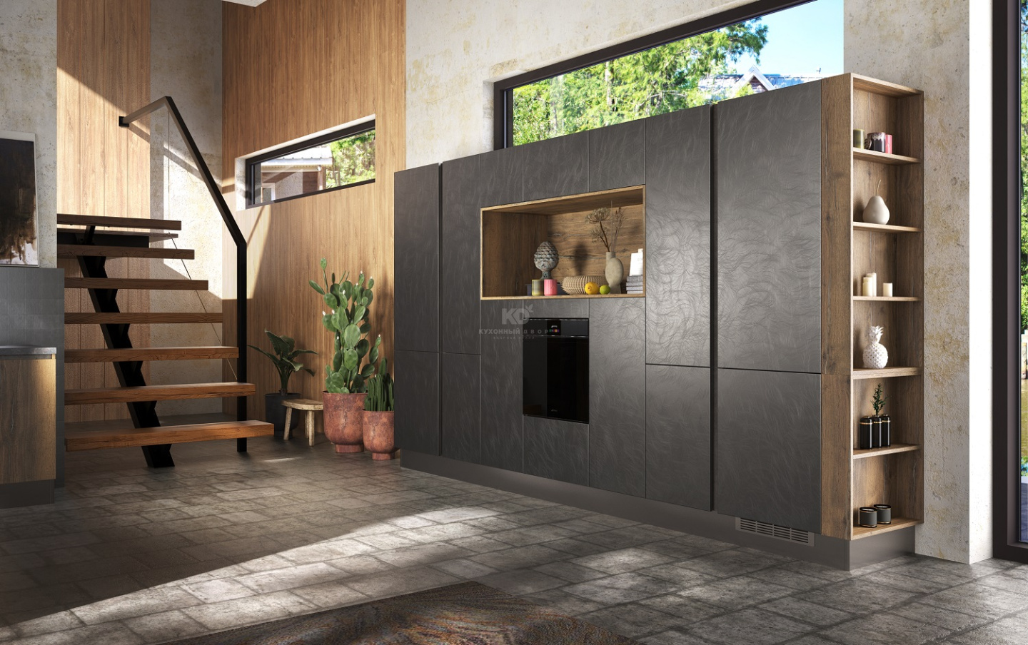 Брутальность и минималистичность подчеркнуты фасадами из экомембраны с отделкой под шлифованный металл. Удивительным образом с ними рядом прижились дверцы из экоплиты с текстурой дерева, в прожилках которого словно «впаяны» вставки под олово. Эта комбинация не только смотрится красиво, но и создает незабываемые тактильные ощущения.