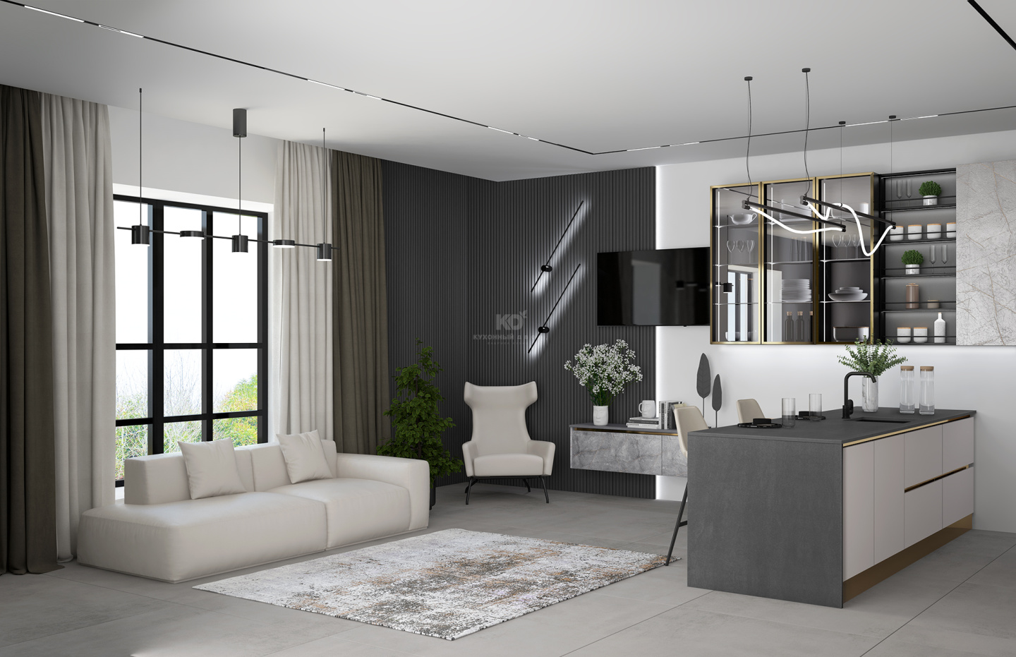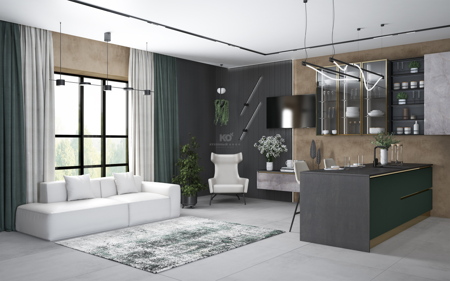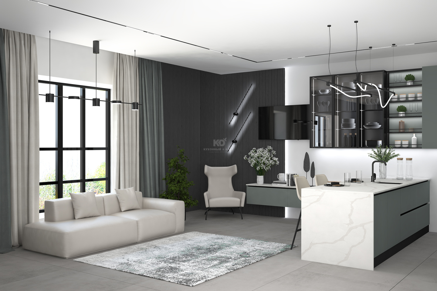 Добро пожаловать в гостиную, которая плавно перетекает в обеденную зону и зону кухни, дополненную эстетичной и вместительной зоной хранения. Все декоративные элементы мебели перекликаются друг с другом, создавая единую композицию. Все детали поют в унисон, и эта симфония наполнена гармонией!
