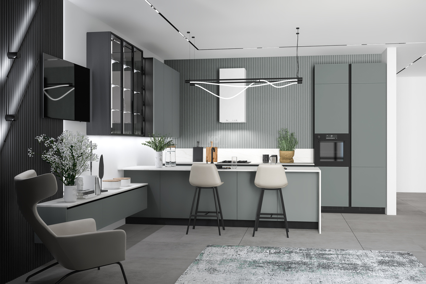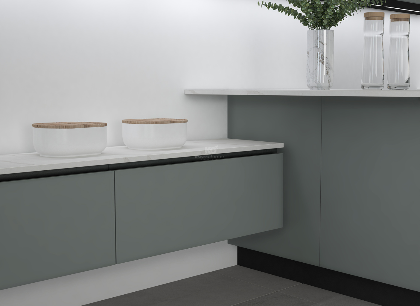 Фасады кухни выполнены из высококачественного МДФ Egger и покрыты матовой однотонной экомембраной по технологии 3D-окутывания. Экомембрана ровно и плотно ложится на поверхность МДФ, не образуя кромок. Этому покрытию не страшны сколы, влажность, УФ-лучи и загрязнения. За такой кухней просто ухаживать и она останется в первозданном виде на протяжении многих лет.