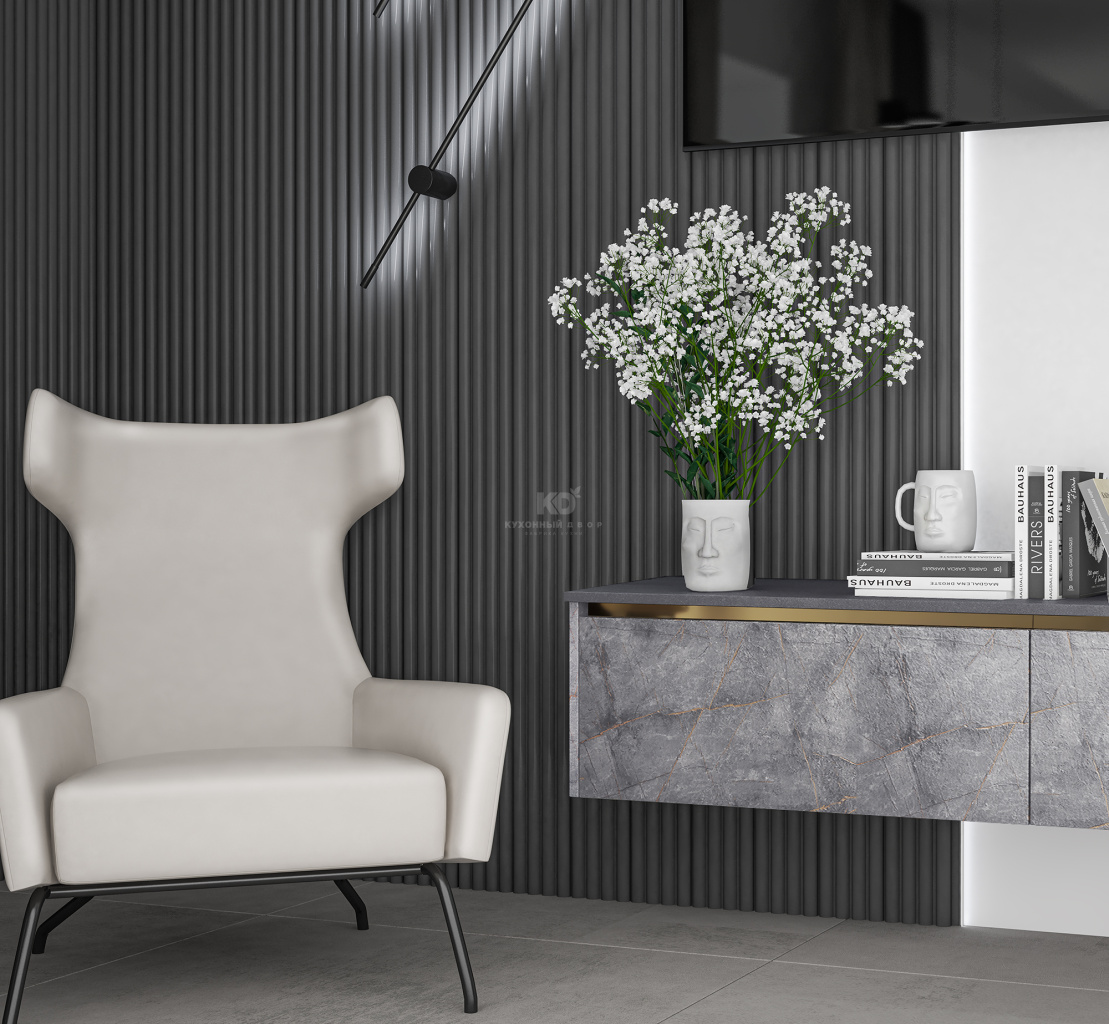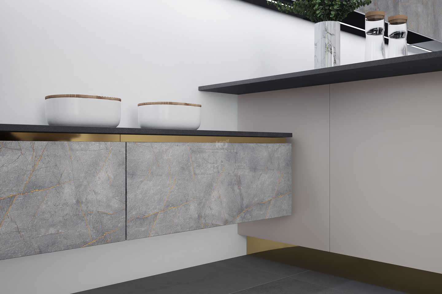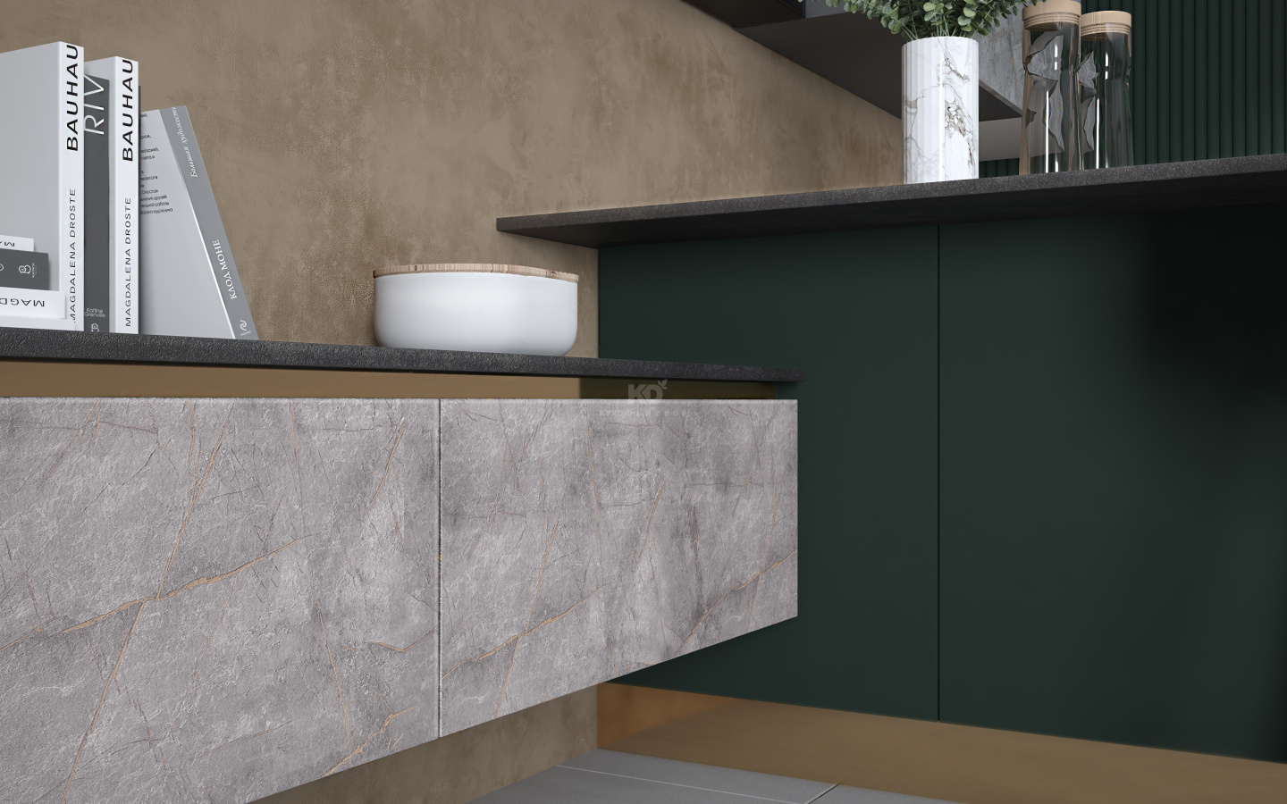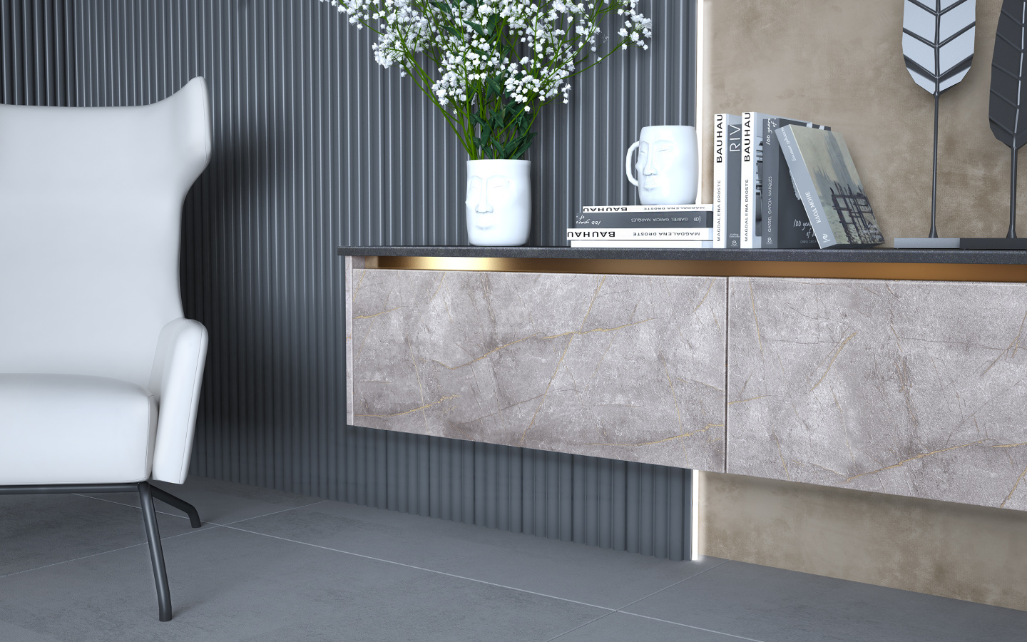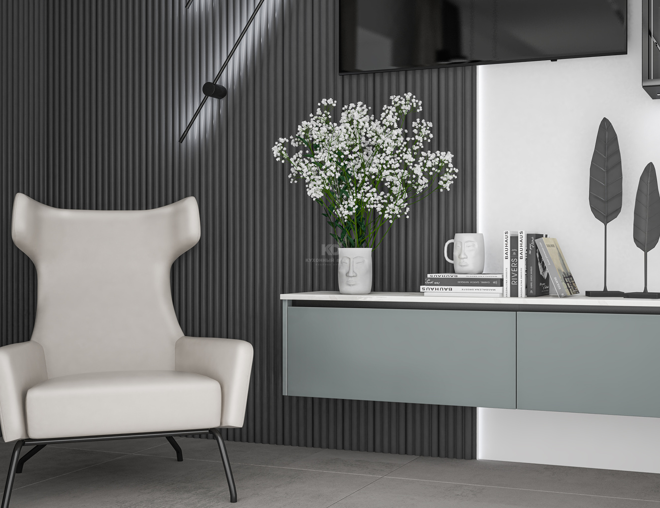 Фасады навесных модулей в TV-зоне и фасады навесных шкафов в зоне кухни выполнены в декоре «византийский мрамор» дымчато-пепельного цвета с благородными медными прожилками, бликующими на свету. Все они оснащены системой Tip-On, благодаря ей дверцы открываются одним лёгким нажатием.