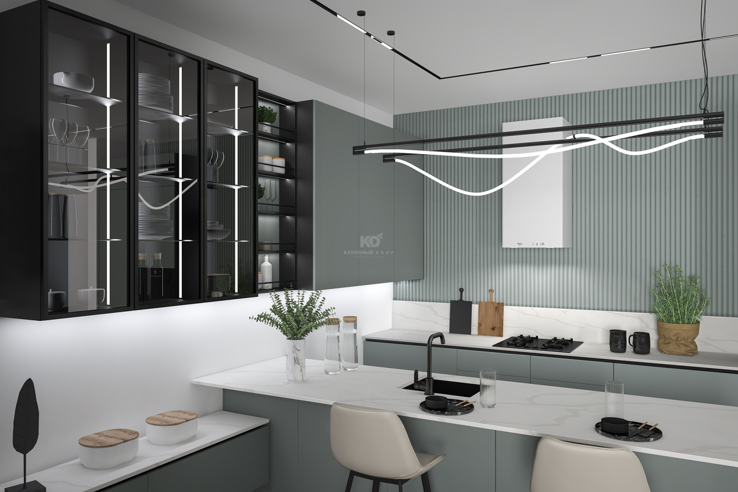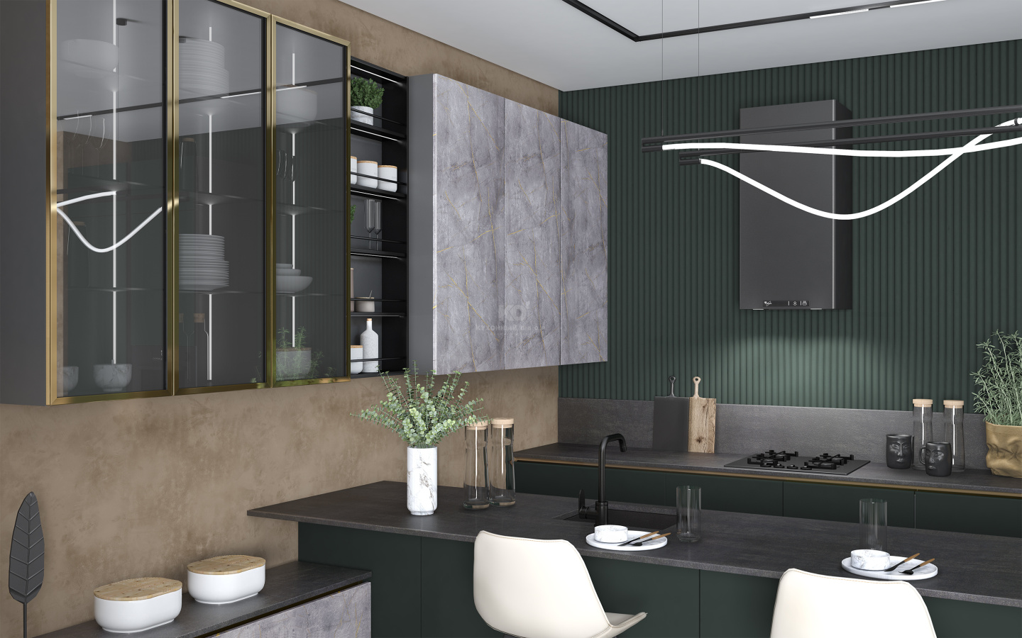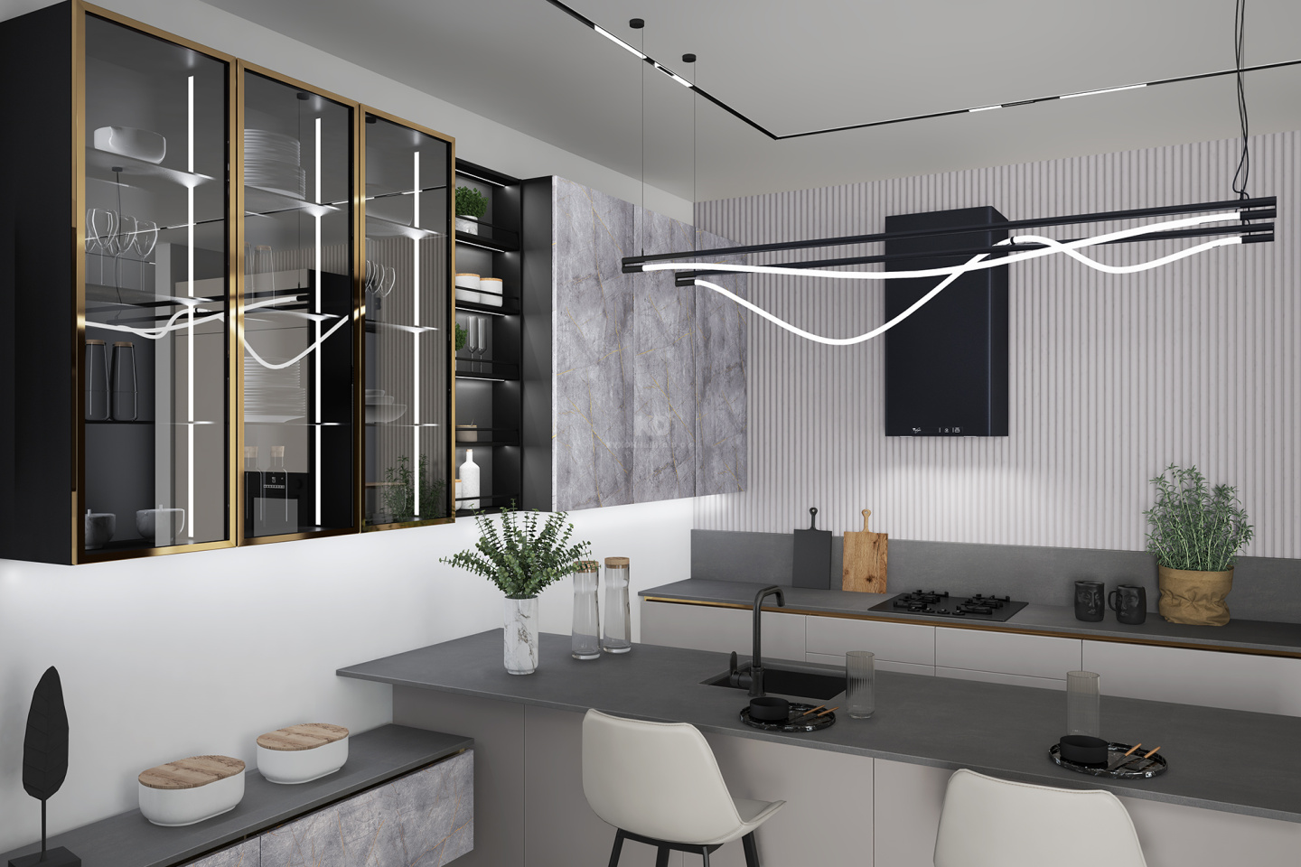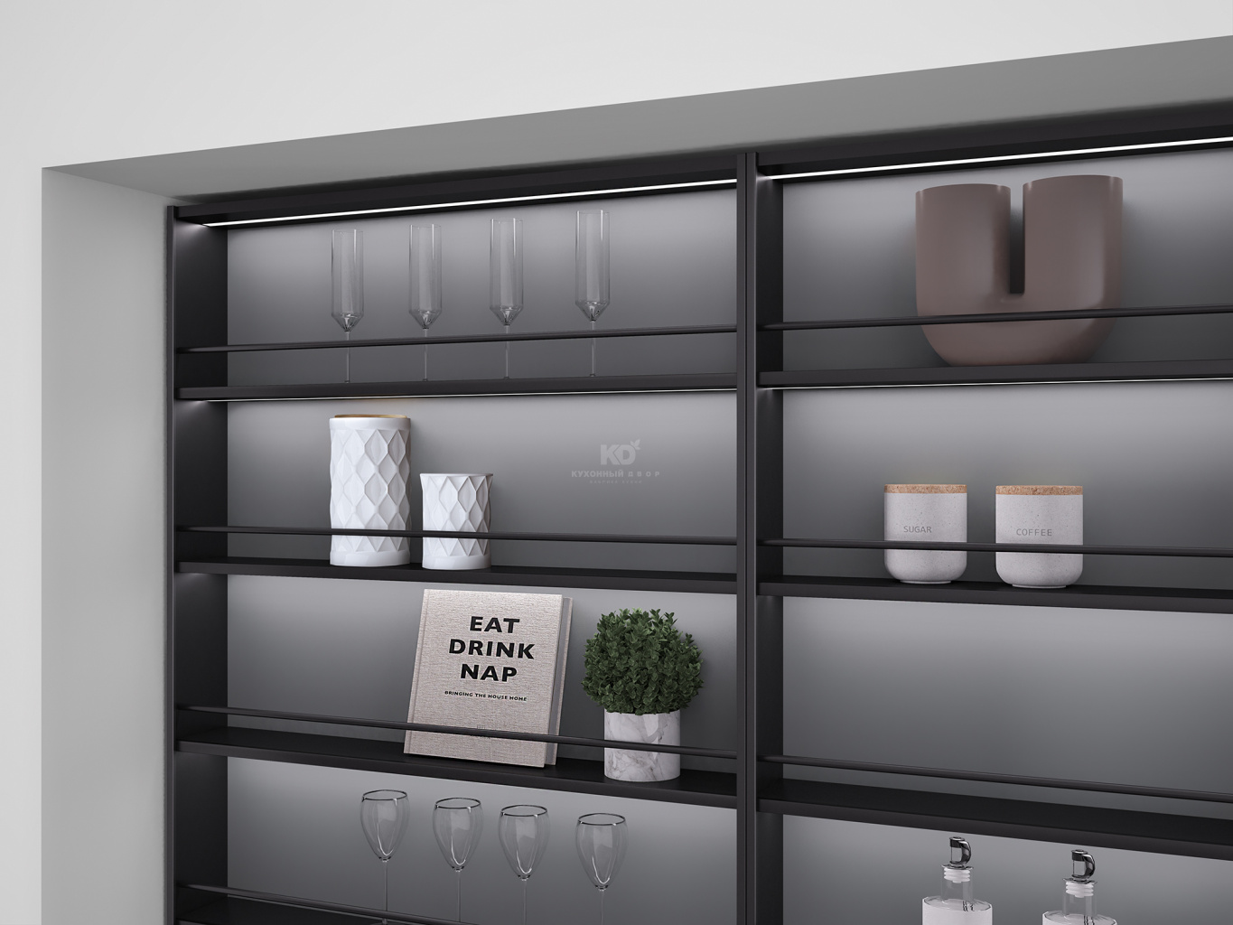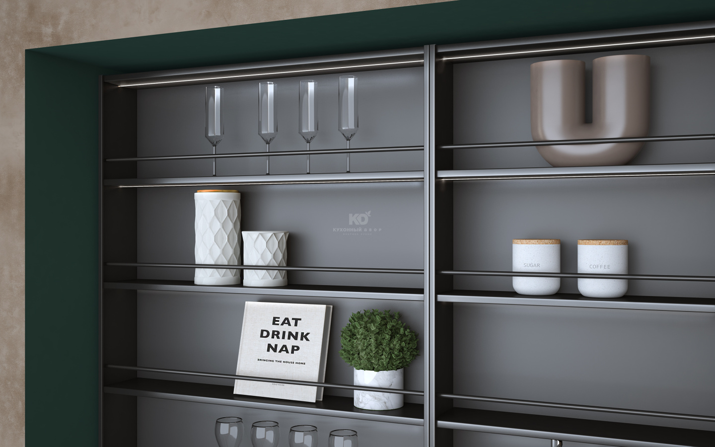 За ощущение лёгкости в архитектуре кухни отвечают витрины с вертикальной подсветкой и стеклянными дверцами, декорированными AL-рамкой в оттенке «брашированное золото». Подсветка придаёт кухне нотку изысканности и выгодно подчёркивает красоту посуды и дорогого сердцу декора.