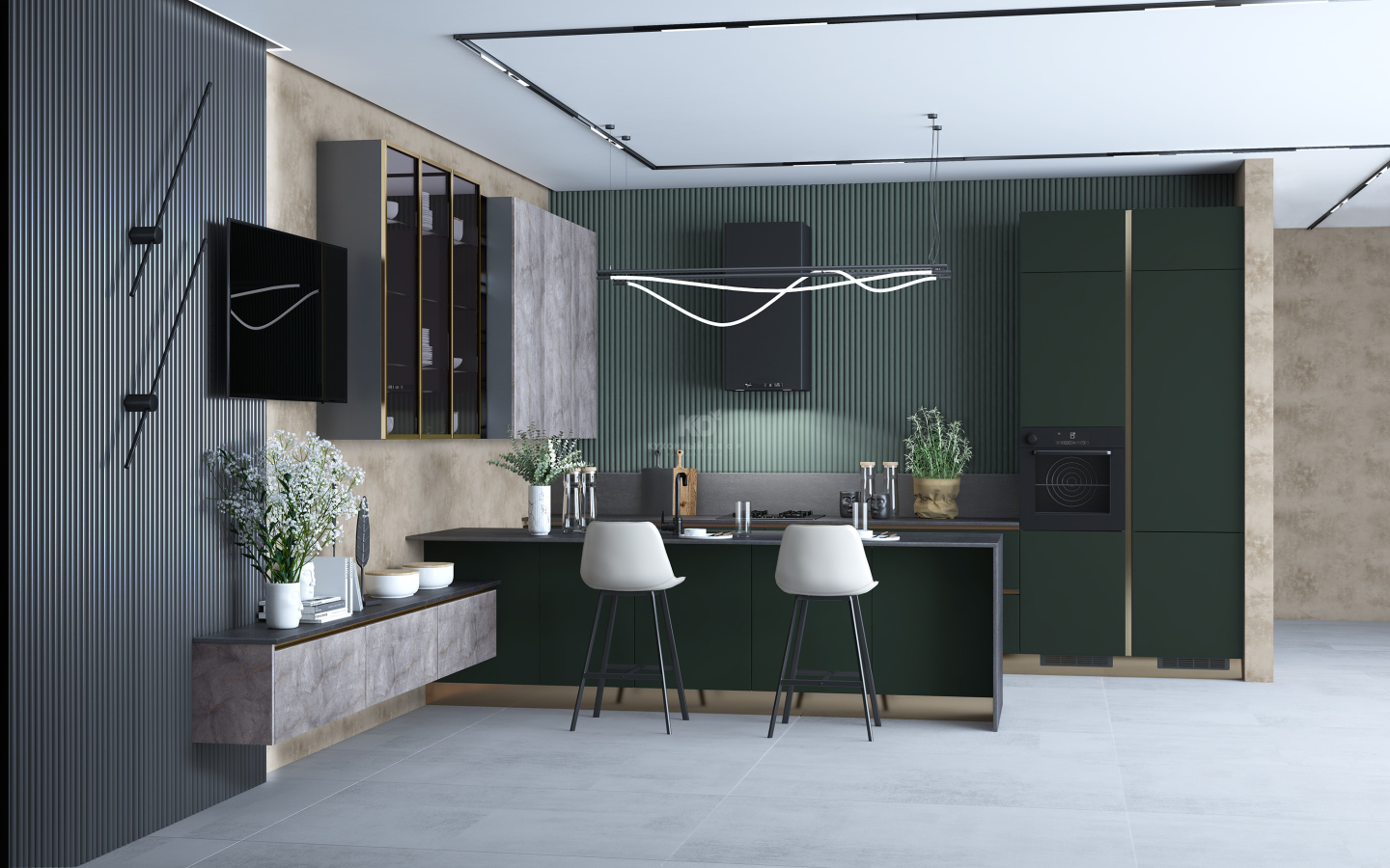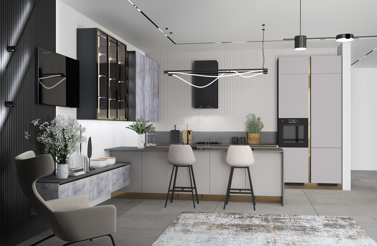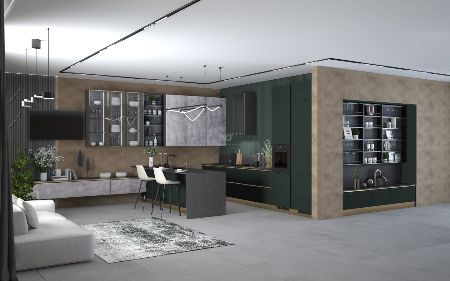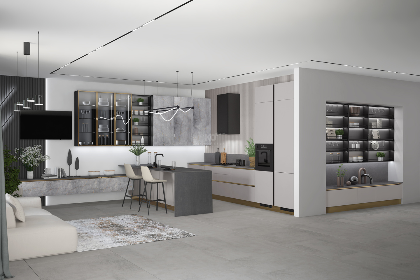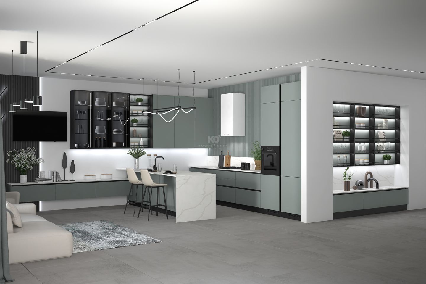 За ощущение лёгкости в архитектуре кухни отвечают витрины с вертикальной подсветкой и стеклянными дверцами, декорированными AL-рамкой в оттенке «брашированное золото». Подсветка придаёт кухне нотку изысканности и выгодно подчёркивает красоту посуды и дорогого сердцу декора.