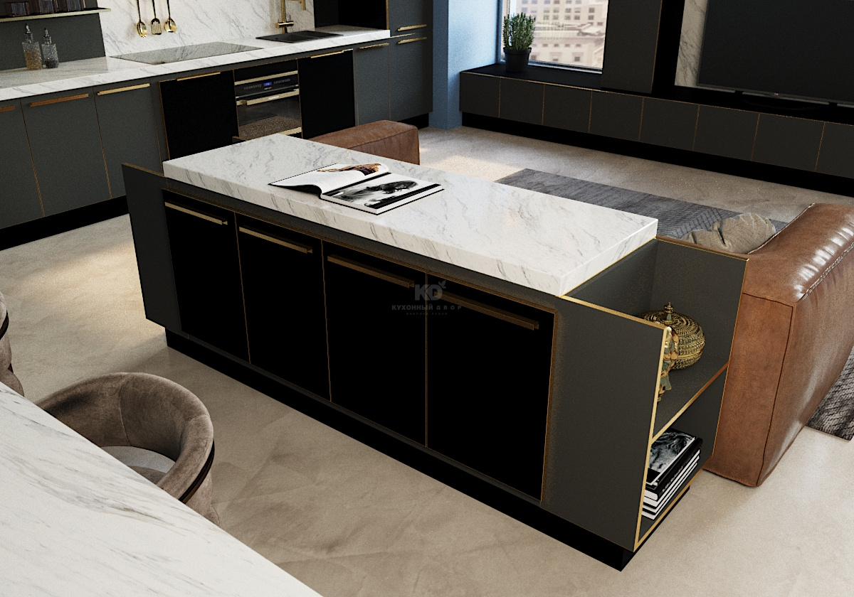 Черно-белые кухни на заказ могут выполняться с любым количеством навесных и напольных шкафов, пеналов, полок и подставок, оснащаться угловыми мойками или варочными поверхностями. Возможно заказать в качестве дополнения гарнитура кухонный остров, полуостров или барную стойку. Эти предметы мебели весьма функциональны и практичны, а также придают помещению привлекательный внешний вид. Кроме того, кухонный остров или барная стойка могут быть задействованы при зонировании помещения.