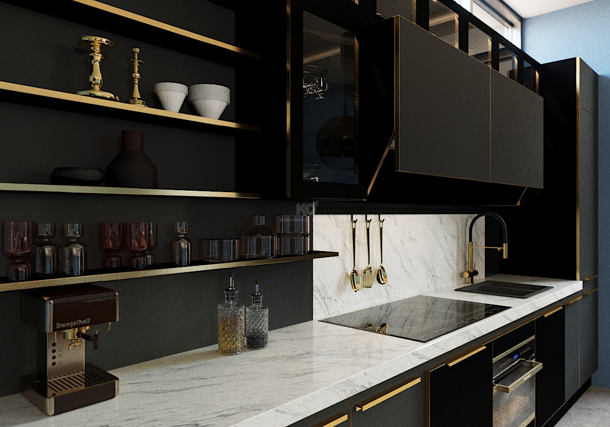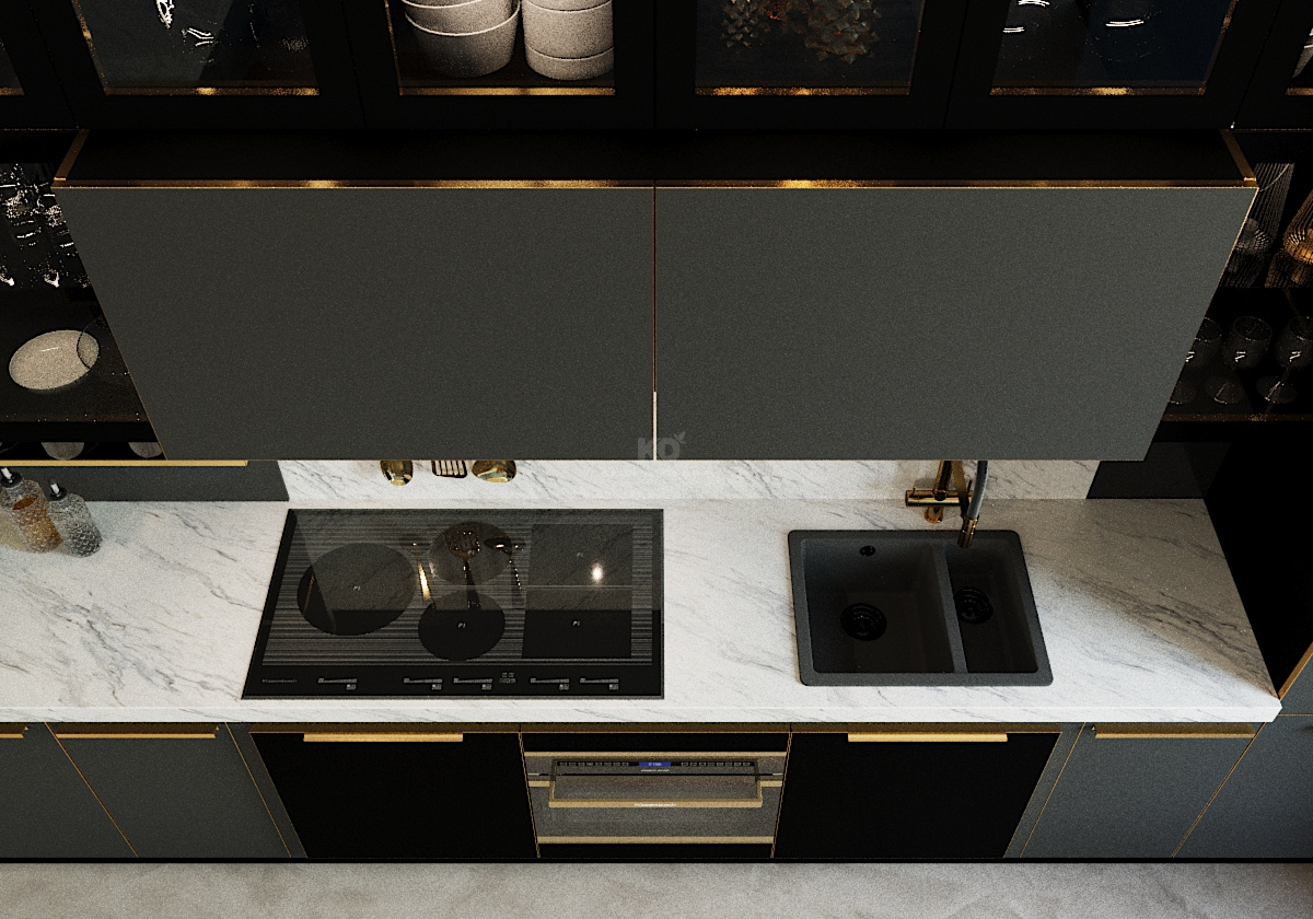 Стоит подумать и об оптимальной конфигурации гарнитура: будете вы устанавливать мебель вдоль одной стены, двух или более. В зависимости от этого и стоит отталкиваться – нужна вам прямая, угловая или П-образная черно-белая кухня на заказ.