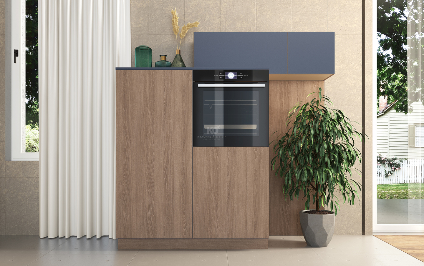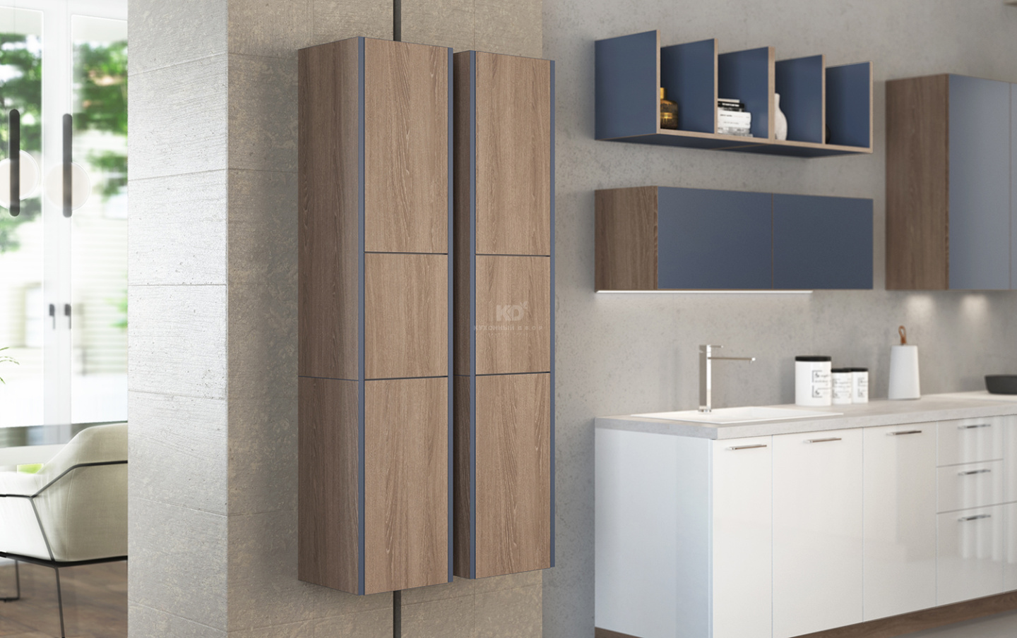 Эта кухня обожает смелые решения. Фасады из покрытой эмалью экоплиты она «по-скандинавски» сочетает с «древесными» цоколями. Рядом со стоящими на полу элементами гармонично сосуществуют «парящие» пеналы, навесные шкафы разных размеров и оригинальные полки с «открытым» верхом. А зона с духовым шкафом и вовсе кажется собранной из отдельных «кубиков», подобно конструктору. Мягкий и уютный минимализм «шведского» формата предстаёт здесь во всей красе!
