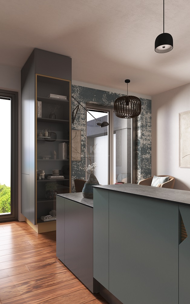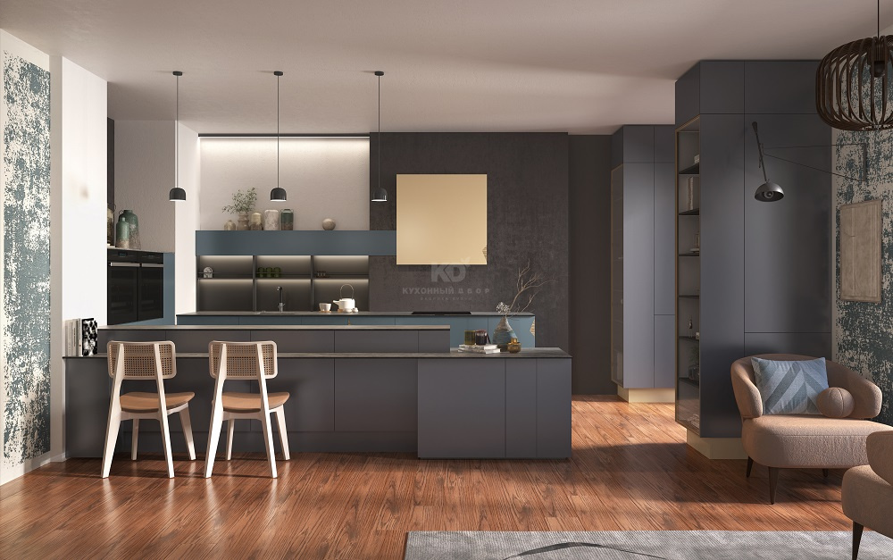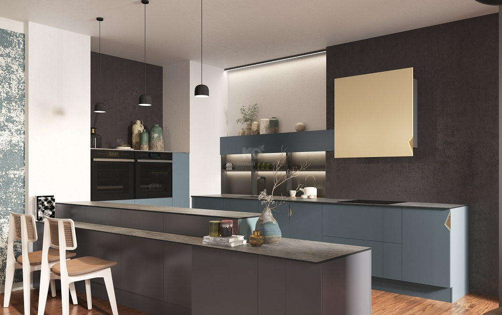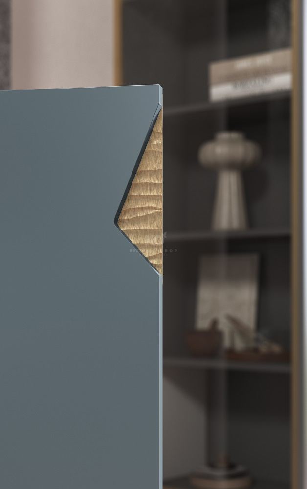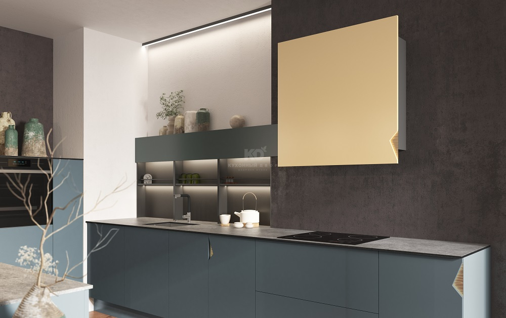 Цельный и стильно выдержанный фасад, выполненный не в тривиальной стилистике. В обычной классике такого не встретишь! Особый шарм ему придает ювелирно-встроенная подсветка теплых цветов. Главные фишки этой модели – нестандартная вытяжка в изумительно стилистике и шкаф-атлант, открывающийся с двух сторон. Этот вместительный исполин не просто гармонично впишется в Ваш интерьер, но и будет служить настоящим Хранителем кухни. Система Кубо с полочками.