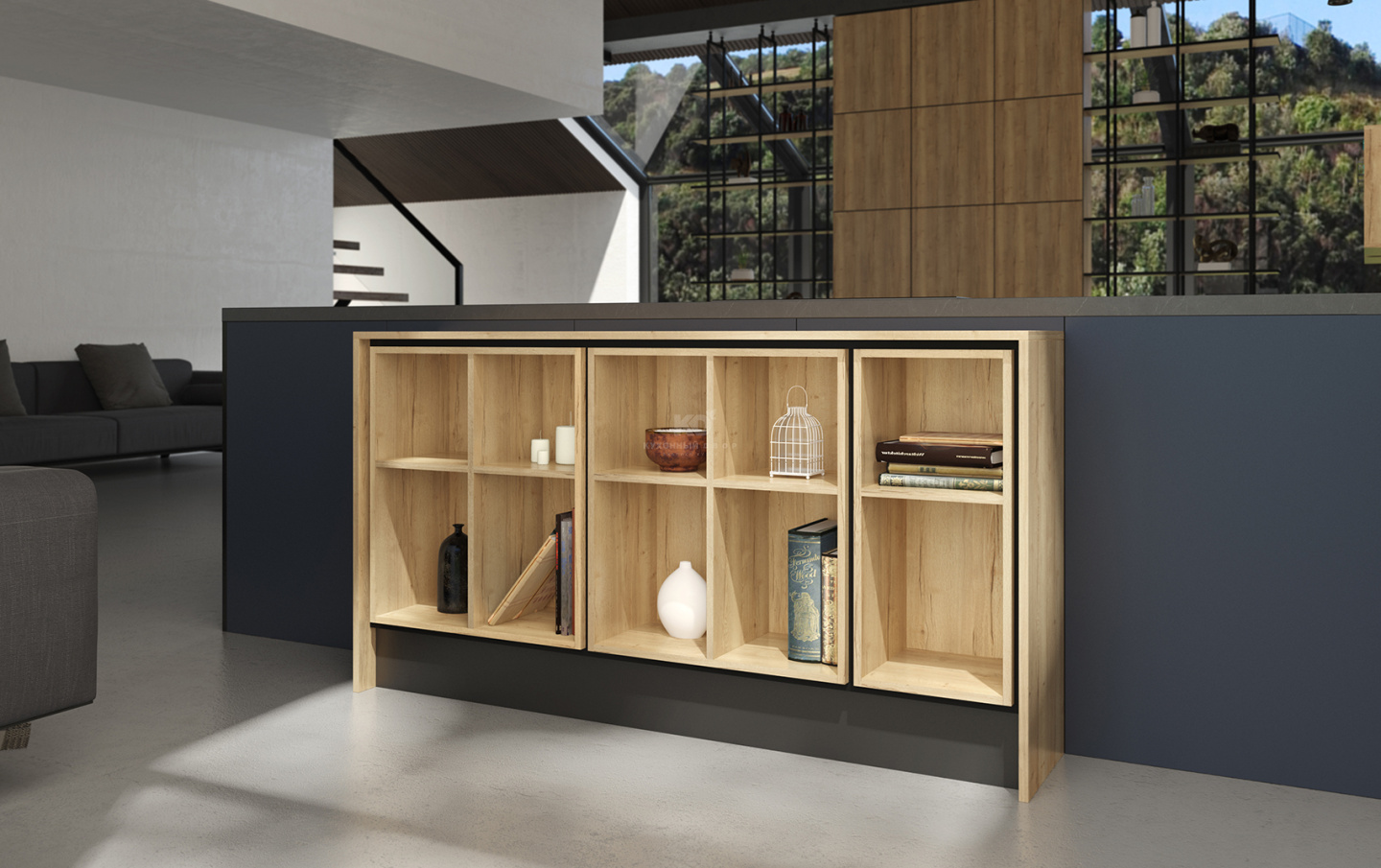 Кто-то назовёт «индиго» цветом Вселенной, и будет прав. В нём заключена красота вечернего неба, на котором загораются первые звёзды. Не удивительно, что этот естественный оттенок синего столь гармонично сочетается с натуральными древесными фактурами. Светлое дерево идеально вписывается в ритмику этой композиции, ведь образует с «индиго» эффектный контраст. Чтобы подчеркнуть его, торцевые части «Генриха окаймлены стильными чёрными кромками. Выглядит очень выразительно!
