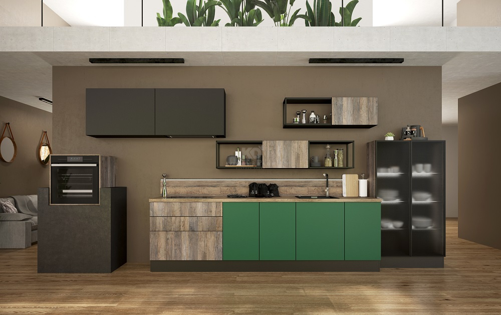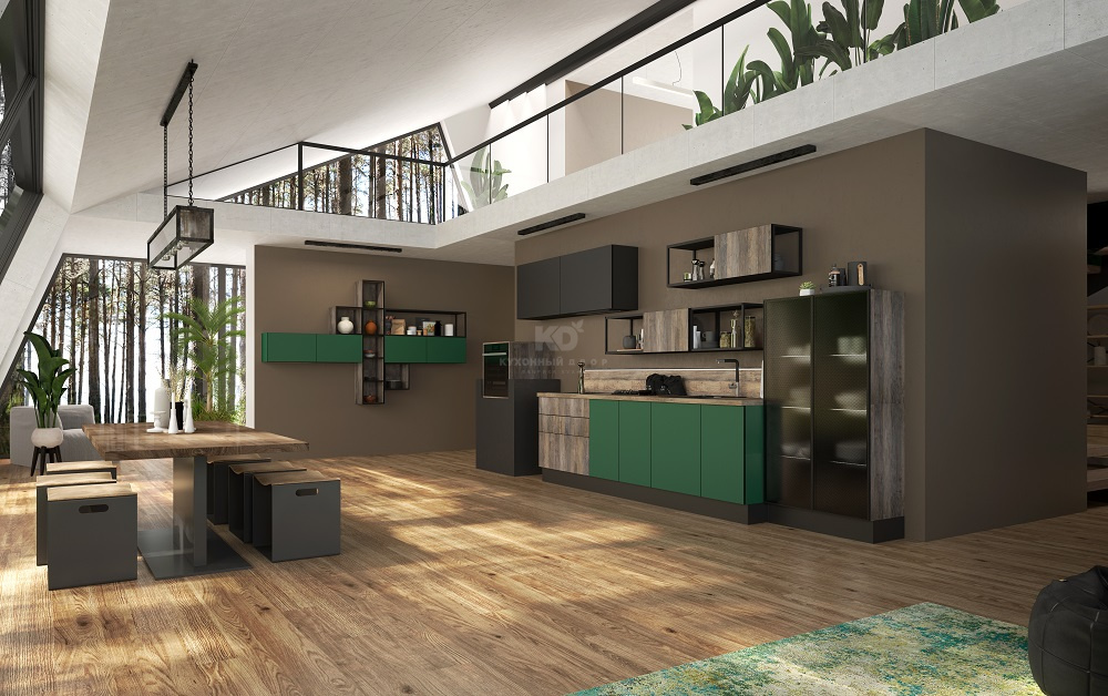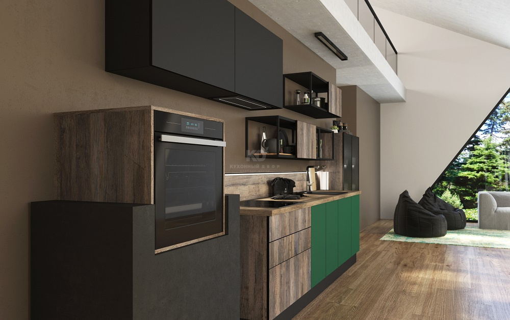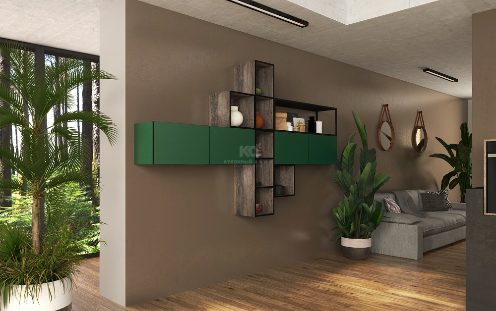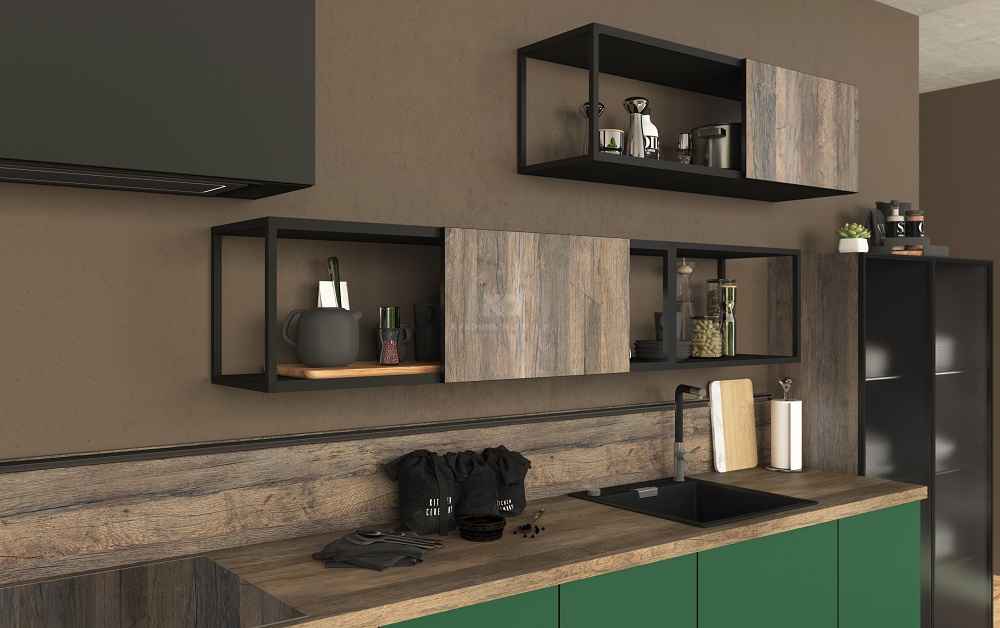 Чёрный цвет остается на пике популярности, и «Ханна Блэк» с удовольствием использует этот тренд. Так в чёрном выполнено всё внутреннее пространство модулей, включая фурнитуру. Также в тёмные тона выкрашены цоколь и каркас открытых полок из анодированного алюминия.