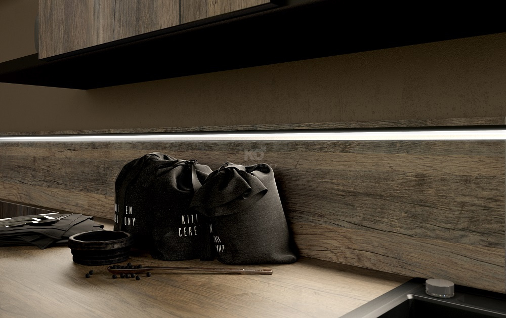 • Настенная панель из фасадного полотна со встроенными светодиодами. Стильно смотрится в рабочей зоне, давая оптимальное количество света для комфортной готовки;
