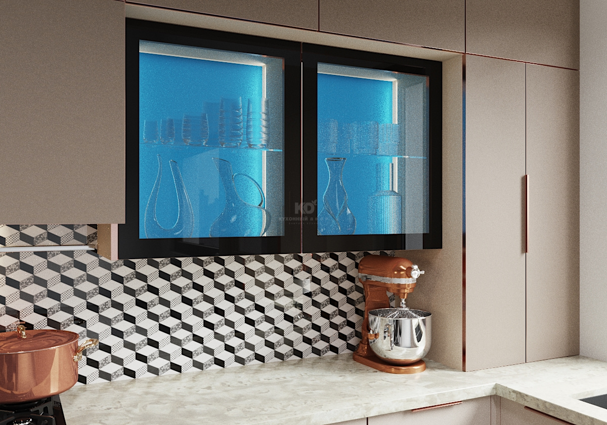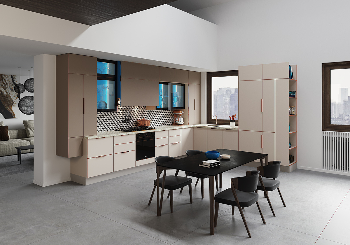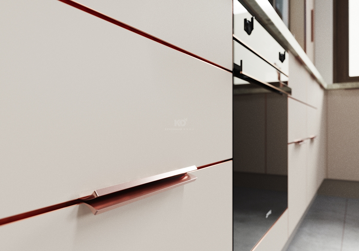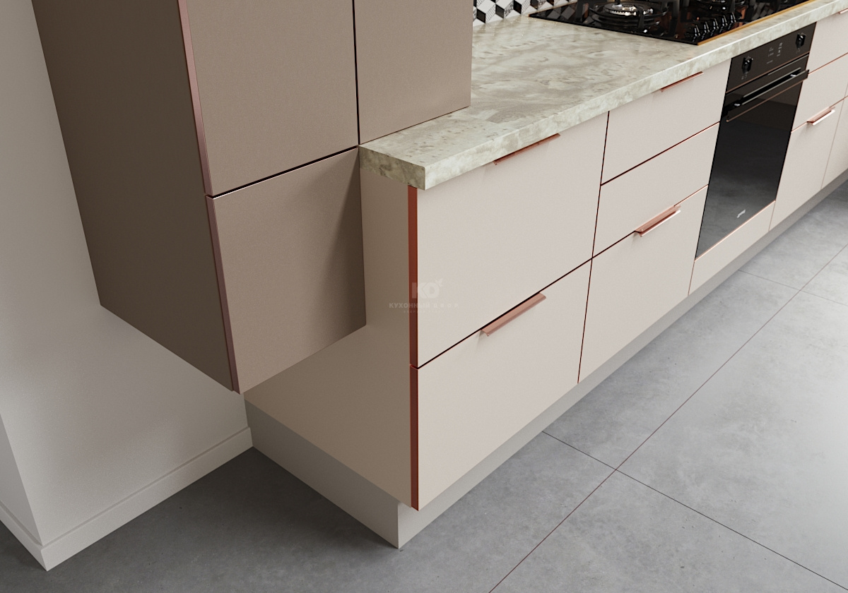 Перед Вами «Ханна Стил» – модель, с которой дизайн творите лично Вы! Комбинируйте закрытые пространства с открытыми зонами. Выбирайте сами, какие ящики снабдить ручками, а какие будут открываться лёгким касанием. Используйте уникальные бархатистые фасады из MDF, на которых не остается следов от прикосновений. Подчёркивайте их красоту изысканными кромками золотого, медного или алюминиевого оттенков. Да, теперь именно Вы выбираете, какой будет кромка Вашей кухни! Три эксклюзивных цвета кромирования и 7 вариантов расцветки фасадов дают Вам 21 цветофактурную комбинацию!