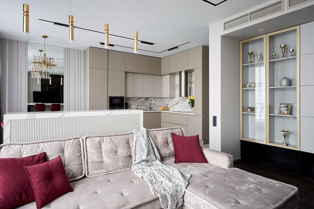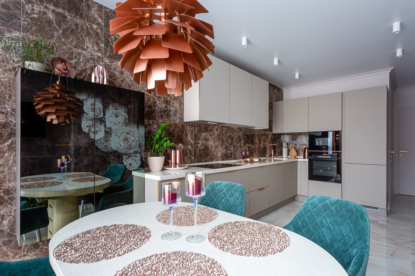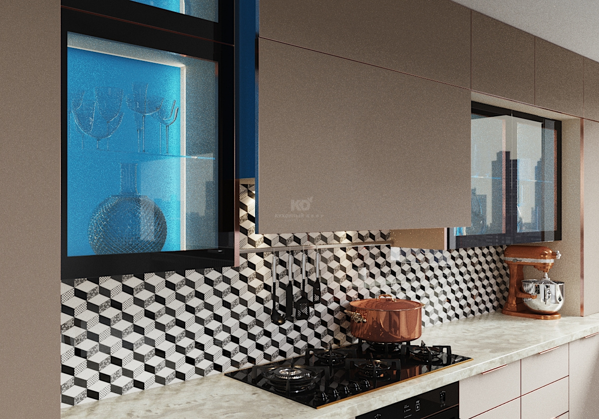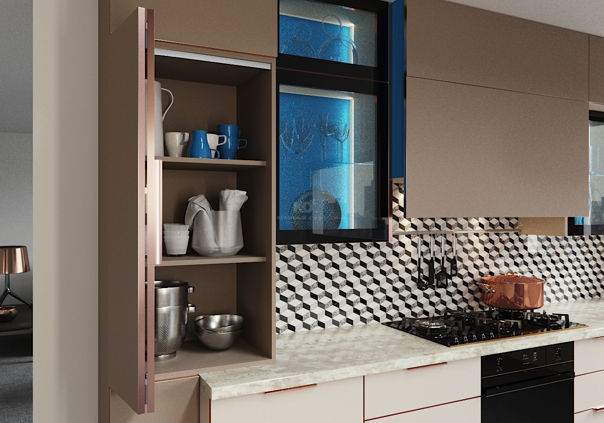 Перед Вами «Ханна Стил» – модель, с которой дизайн творите лично Вы! Комбинируйте закрытые пространства с открытыми зонами. Выбирайте сами, какие ящики снабдить ручками, а какие будут открываться лёгким касанием. Используйте уникальные бархатистые фасады из MDF, на которых не остается следов от прикосновений. Подчёркивайте их красоту изысканными кромками золотого, медного или алюминиевого оттенков. Да, теперь именно Вы выбираете, какой будет кромка Вашей кухни! Три эксклюзивных цвета кромирования и 7 вариантов расцветки фасадов дают Вам 21 цветофактурную комбинацию!