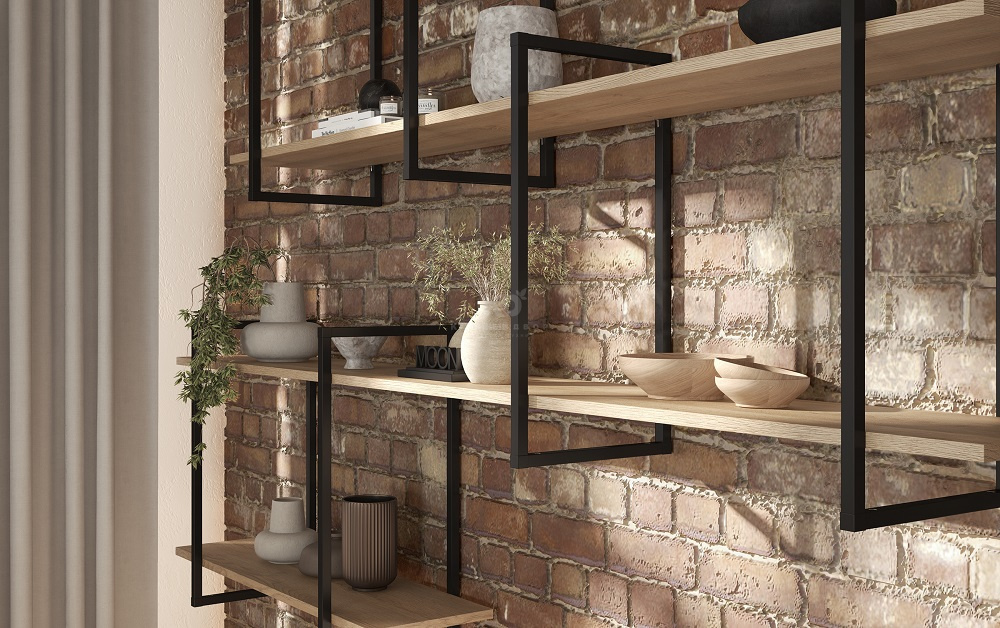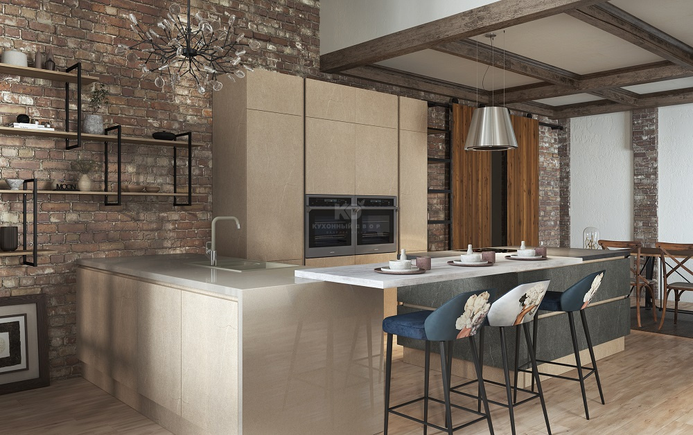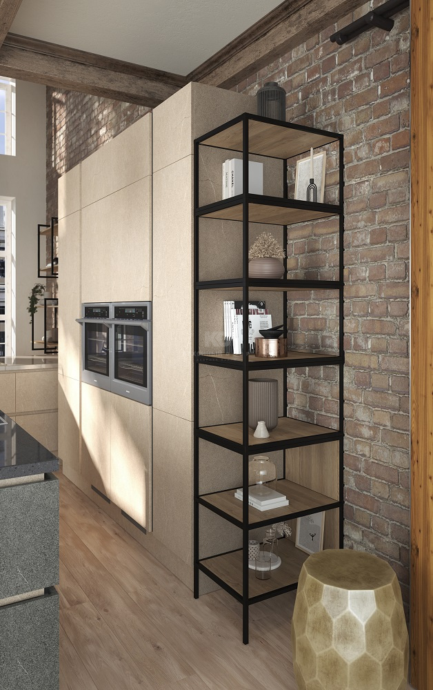 Модель впечатляет не только уникальностью фасадов, но и оригинальностью архитектуры. Так, система открывания «Space Line» со скрытыми ручками-профилями придаёт строгим формам её корпуса интригующий объём. А обилие открытых элементов из анодированного алюминия добавляет лёгкости! «Ноа Лофт Песчаник» может одновременно иметь в своем составе как высокие стеллажи большой вместимости, так и замысловатую сеть полочек, на которых удобно хранить декор, посуду и специи. Оба элемента прекрасно смотрятся в едином пространстве, выводя красоту и эргономичность кухни на новый уровень.