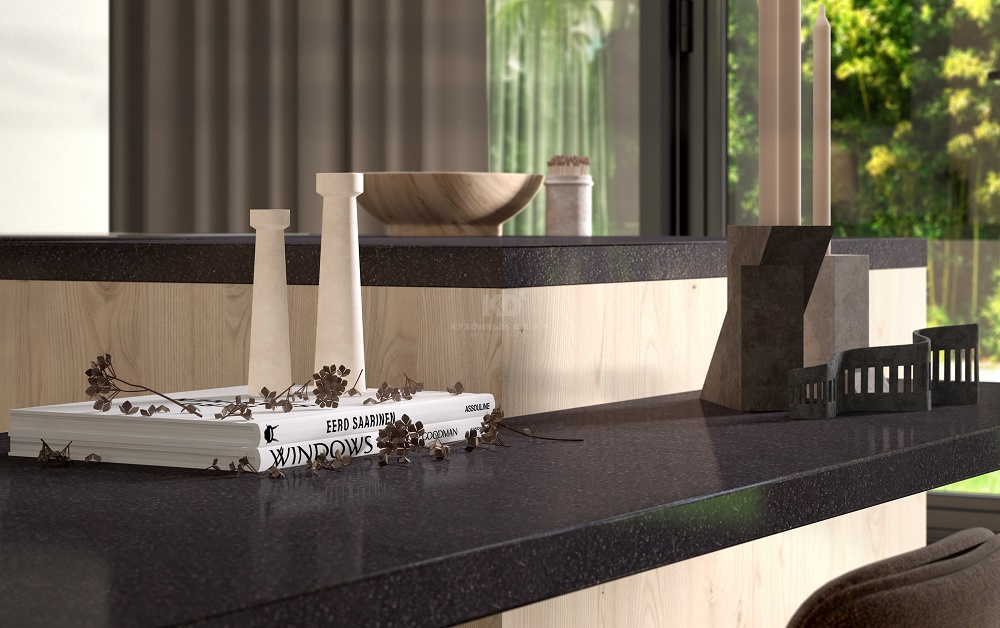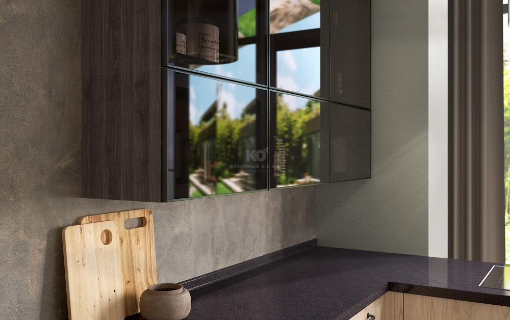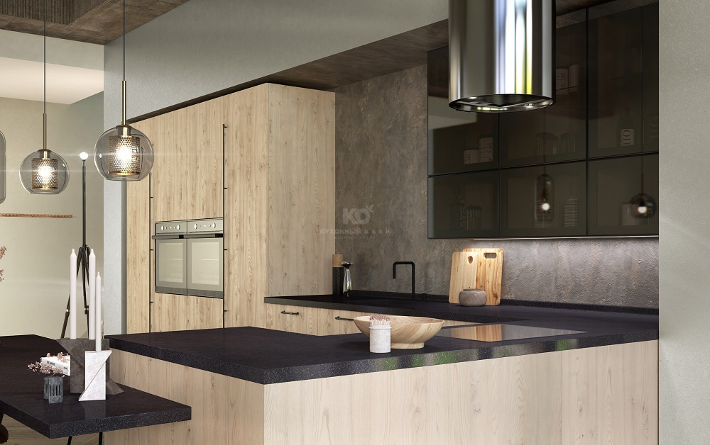 Естественная красота «Стоун Вуд» кажется неукротимой, однако умело «приручается» дизайнерскими решениями в стиле «модерн». Контрастная каменная столешница, навесные шкафы с тонированными стёклами, лаконичная фурнитура и стильная обеденная зона смягчают природную энергетику, делая облик модели сбалансированным и спокойным.