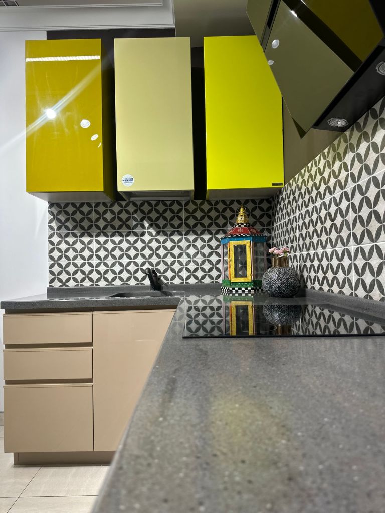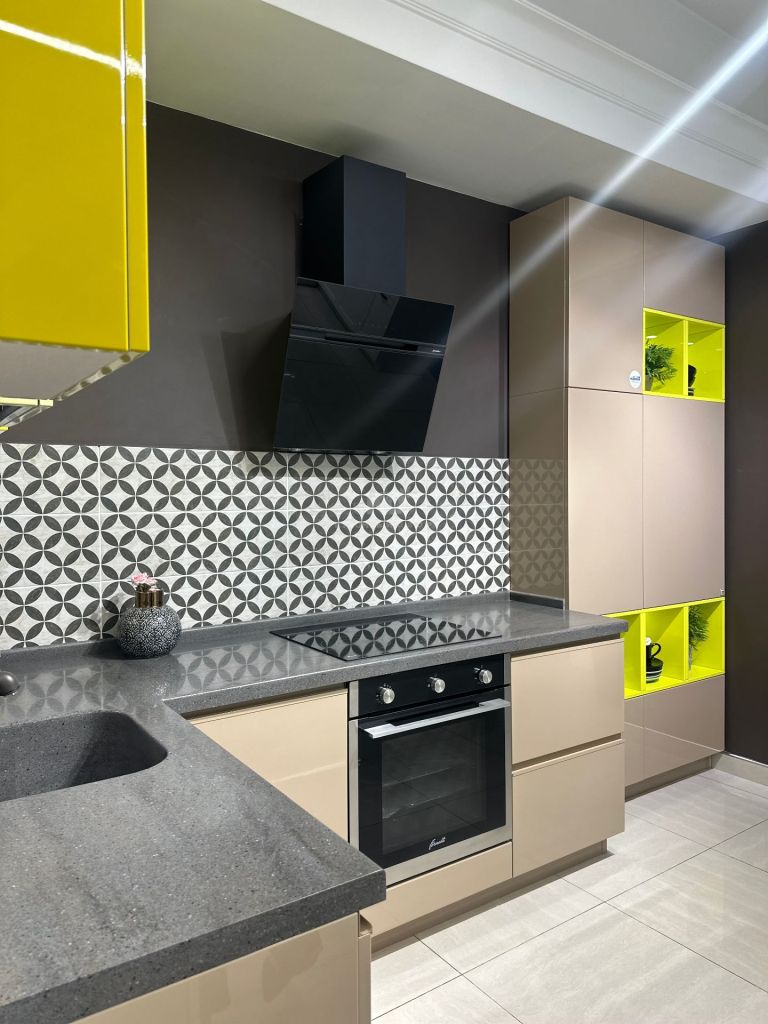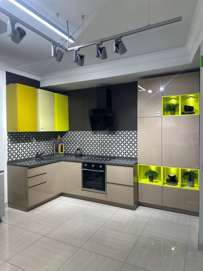 Особенности: Литая мойка, оригинальное цветовое решение. Открытые полки.
