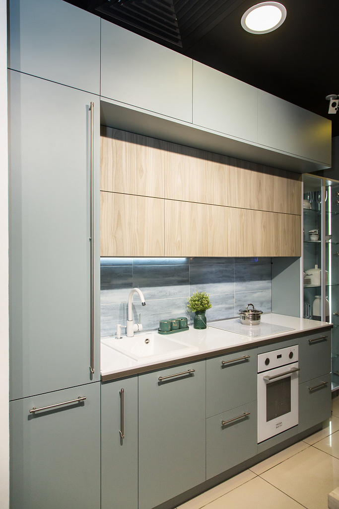 Для изготовления мебели используются разные материалы. Наш фирменный салон кухни предлагает гарнитуры из массива ясеня, бука и дуба, а также МДФ: обычного, облицованного шпопом или с покрытием из экомембраны. В более бюджетном сегменте представлены модели из экомассива и экоплит Egger.