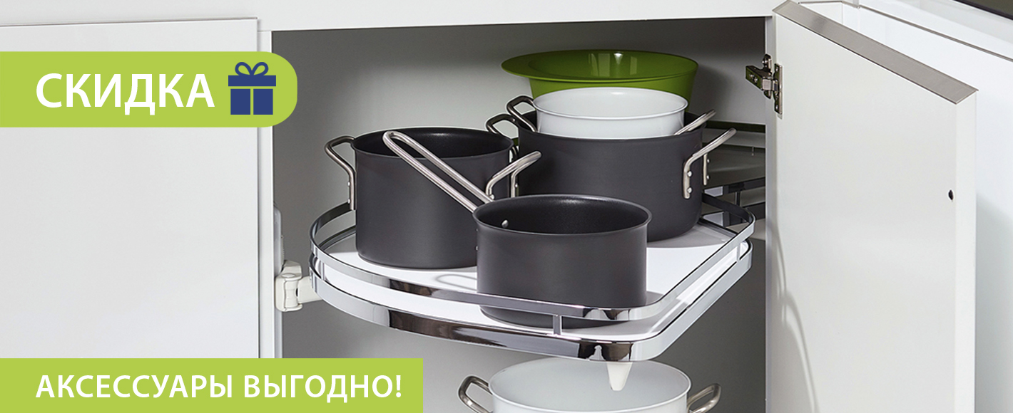 При заказе кухонного гарнитура от 80 000 руб. получите скидку 30% на широкий ассортимент аксессуаров, которые сделают вашу кухню не только красивой, но и практичной.