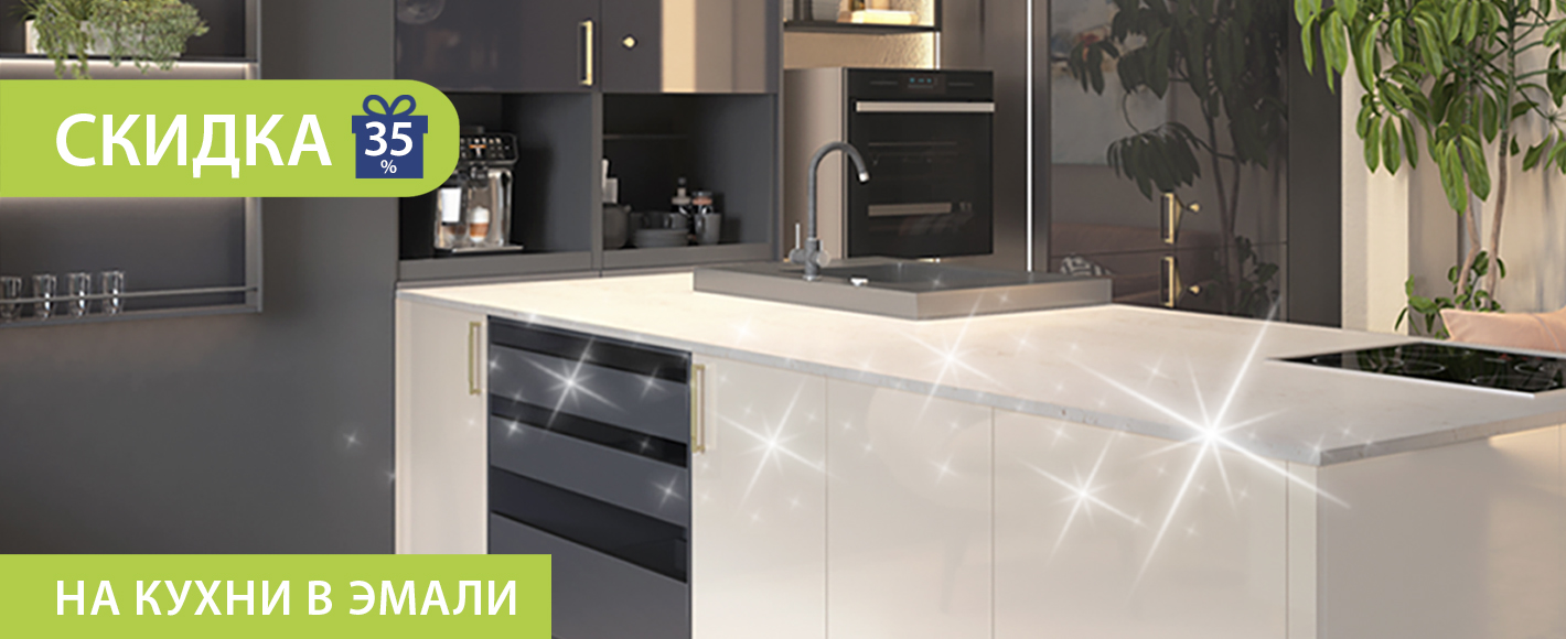 Станьте обладателем кухни, сияющей как бриллиант, или наслаждайтесь бархатной элегантностью! Кухни с фасадами в эмали от «Кухонного Двора» предлагают два идеальных варианта для вашего интерьера с дополнительной выгодой - 30%!